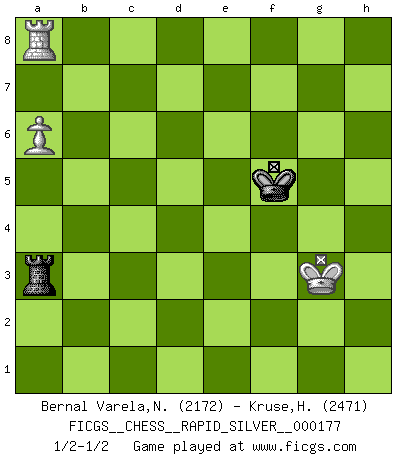 Last move : 1/2-1/2 2017 July 5 13:26:25 [Event "FICGS__CHESS__RAPID_SILVER__000177"] [Site "FICGS"] [Date "2017.05.08"] [Round "2"] [White "Bernal Varela,Nelson"] [Black "Kruse,Herbert"] [Result "1/2-1/2"] [WhiteElo "2172"] [BlackElo "2471"] 1.e4 e5 2.Nf3 Nc6 3.Bc4 Nf6 4.Ng5 d5 5.exd5 Na5 6.Bb5+ c6 7.dxc6 bxc6 8.Bd3 Nd5 9.Nf3 Bd6 10.O-O Nf4 11.Re1 Nxd3 12.cxd3 O-O 13.Nc3 c5 14.b3 f6 15.Ne4 Be7 16.Ba3 Nb7 17.b4 Qxd3 18.Re3 Qd5 19.bxc5 Nxc5 20.d4 Nxe4 21.Bxe7 Re8 22.dxe5 Qxd1+ 23.Rxd1 Rxe7 24.Rxe4 Bb7 25.Re3 Bxf3 26.gxf3 fxe5 27.Rd5 Rf8 28.R3xe5 Rxe5 29.Rxe5 Rxf3 30.Ra5 Rf7 31.h4 Rf4 32.h5 h6 33.Kg2 a6 34.Kg3 Rf6 35.Rc5 Re6 36.a4 Kf7 37.f4 Kf6 38.Kf3 Rd6 39.Kg4 g6 40.Kg3 gxh5 41.Rxh5 Kg7 42.Rc5 Kf6 43.Kf3 Kg6 44.a5 Rd4 45.Rc6+ Kf5 46.Rxa6 h5 47.Kg3 Ra4 48.Ra8 h4+ 49.Kxh4 Rxf4+ 50.Kg3 Ra4 51.a6 Ra3+ 1/2-1/2 Two knights defense Kingside Castling by player White (move 10) Kingside Castling by player Black (move 12) 10 pieces endgame at move 29 : White KRPPP , Black KRPPP WHITE : King + 1 Rook 3 Pawns BLACK : King + 1 Rook 3 Pawns 9 pieces endgame at move 40 : White KRPP , Black KRPPP WHITE : King + 1 Rook 2 Pawns BLACK : King + 1 Rook 3 Pawns 8 pieces endgame at move 41 : White KRPP , Black KRPP WHITE : King + 1 Rook 2 Pawns BLACK : King + 1 Rook 2 Pawns 7 pieces endgame at move 46 : White KRPP , Black KRP WHITE : King + 1 Rook 2 Pawns BLACK : King + 1 Rook 1 Pawn 6 pieces endgame at move 49 : White KRPP , Black KR WHITE : King + 1 Rook 2 Pawns BLACK : King + 1 Rook 5 pieces endgame at move 49 : White KRP , Black KR WHITE : King + 1 Rook 1 Pawn BLACK : King + 1 Rook This chess game ended in a draw. Follow this game move after move (download)I played Chess with him and would have beaten him sometimes only he always took back his last move, and ran the game out differently. (Mark Twain) Gewöhnliche Menschen denken nur daran, wie sie ihre Zeit verbringen. Ein intelligenter Mensch versucht, sie auszunutzen. (Arthur Schopenhauer) Siempre es mejor sacrificar los hombres de tu oponente. (Savielly Tartakower) Ne tendez aucun piège pour le plaisir ! Ne jouez rien dans l'espoir que l'adversaire réagisse de façon stupide ! Prenez toujours pour acquis que l'adversaire va trouver le meilleur coup ! Ne jouez jamais de coup dans l'espoir que l'adversaire ne voie pas la menace ! Chacun de vos coups doit améliorer la position d'une façon ou d'une autre. A good aphorism is too hard for the tooth of time, and is not worn away with the centuries, although it serves as food for every speech. (Friedrich Nietzsche)