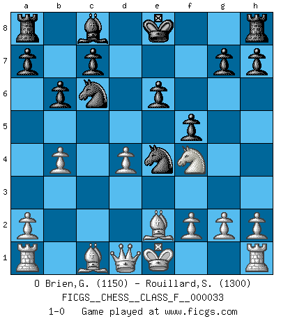 Last move : 1-0 2007 July 12 16:44:26 [Event "FICGS__CHESS__CLASS_F__000033"] [Site "FICGS"] [Date "2007.04.08"] [Round "1"] [White "O Brien,Glenn"] [Black "Rouillard,Stephane"] [Result "1-0"] [WhiteElo "1150"] [BlackElo "1300"] 1.e4 e6 2.d4 d5 3.Nc3 dxe4 4.Nxe4 Bb4+ 5.c3 Ba5 6.Nf3 f5 7.Nc5 b6 8.Nd3 Nc6 9.b4 Qd5 10.Be2 Nf6 11.Nf4 Qe4 12.Ng5 Bxb4 13.Nxe4 Nxe4 14.cxb4 1-0 This chess game has been lost on time (started : 2007.04.08 0:3:28) French : Rubinstein variation Player White won this chess game. Follow this game move after move (download)The King is a fighting piece. Use it ! (Wilhelm Steinitz) Es hat in meinem Leben Zeiten gegeben, in denen das Schachspiel, wenn nicht zum Lebenszweck, so doch zu einem regelrechten Lebensersatz geworden ist. Man fühlt sich in solchen Zeiten nicht so, als besäße man eine göttliche Gabe, sondern eher so, als sei man von ihr besessen. (Garry Kasparov) EL Ajedrez es como la vida. (Boris Spassky) La tactique est l'élément le plus important du milieu de jeu. (Siegbert Tarrasch) All battles are fought by scared men who'd rather be someplace else. (John Wayne in the movie In harm's way)