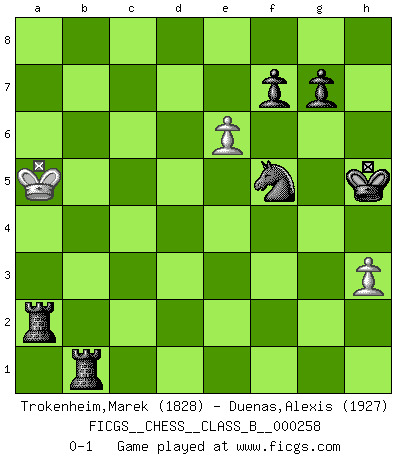 Last move : 0-1 2017 May 14 16:34:27 [Event "FICGS__CHESS__CLASS_B__000258"] [Site "FICGS"] [Date "2017.05.09"] [Round "1"] [White "Trokenheim,Marek"] [Black "Duenas,Alexis"] [Result "0-1"] [WhiteElo "1828"] [BlackElo "1927"] 1.b4 e5 2.Bb2 Bxb4 3.Bxe5 Nf6 4.e3 d5 5.Nf3 O-O 6.c4 Bf5 7.Bb2 c5 8.cxd5 Nxd5 9.Nc3 Nc6 10.Be2 Nxc3 11.dxc3 Ba5 12.O-O Qxd1 13.Raxd1 Rad8 14.Ba3 b6 15.Bb5 Ne7 16.Bb2 Be6 17.Ne5 Bxa2 18.Nd7 Bb3 19.Rd3 Rfe8 20.Ra1 c4 21.Rd6 h5 22.g3 h4 23.e4 Ng6 24.f4 Rc8 25.Re1 Bc2 26.Rd4 Bd3 27.Kf2 Re7 28.e5 Bf5 29.Red1 Bg4 30.R1d2 R7e8 31.gxh4 Ne7 32.Ba6 Rc7 33.Bb5 Rec8 34.Ba6 Ra8 35.Bxc4 Be6 36.Ba6 Nf5 37.R4d3 Nxh4 38.Rd1 Nf5 39.h3 Kh8 40.Kf3 Re8 41.Ke2 Ne7 42.c4 Bb4 43.Kf3 Ra8 44.Bb5 Nf5 45.Ra1 Rac8 46.Rad1 Ra8 47.Ra1 Rg8 48.Ke4 Be7 49.Ba3 Rgc8 50.Bxe7 Nxe7 51.Ke3 Nf5+ 52.Kd2 Kh7 53.Ra4 Kh6 54.Ra1 Bxc4 55.Bxc4 Rxc4 56.Rxa7 Rc2+ 57.Kd1 Rc1+ 58.Ke2 R8c2+ 59.Kf3 Rc4 60.Ra6 Kh5 61.Nxb6 Rf1+ 62.Ke2 Rcxf4 63.Kd2 R4f2+ 64.Kc3 Rc1+ 65.Kb3 Rc6 66.Kb4 Rfc2 67.Rf3 Nd4 68.Na4 Rxa6 69.Rf5+ Nxf5 70.Nb6 Rxb6+ 71.Ka5 Rb1 72.e6 Ra2+ 0-1 Polish (Sokolsky) opening Kingside Castling by player Black (move 5) Kingside Castling by player White (move 12) 10 pieces endgame at move 69 : White KNPP , Black KRRNPP WHITE : King + 1 Knight 2 Pawns BLACK : King + 2 Rooks 1 Knight 2 Pawns 9 pieces endgame at move 70 : White KPP , Black KRRNPP WHITE : King + 2 Pawns BLACK : King + 2 Rooks 1 Knight 2 Pawns Player Black won this chess game. Follow this game move after move (download)It is difficult to play against Einstein's theory --on his first loss to Fischer. (Mikhail Tal) Wenn man heute mit 14 Jahren noch kein GM ist, kann man es vergessen. (Viswanathan Anand) No existe un remordimiento como el remordimiento del Ajedrez. (H. G. Wells) Les Echecs, c'est l'art de la guerre sans les charniers, c'est la résurrection des morts tombés au champ d'honneur, l'espoir perpétuel, la suprématie de l'intelligence sur la force, la culture de l'esprit. (F. Szpiner) The real voyage of discovery consists not in seeking new lands but in seeing with new eyes. (Marcel Proust)