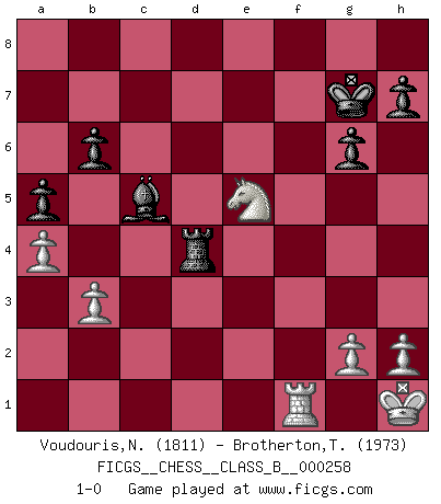 Last move : 1-0 2017 November 21 1:53:4 [Event "FICGS__CHESS__CLASS_B__000258"] [Site "FICGS"] [Date "2017.05.09"] [Round "1"] [White "Voudouris,Nick"] [Black "Brotherton,Trevor"] [Result "1-0"] [WhiteElo "1811"] [BlackElo "1973"] 1.d4 Nf6 2.f4 e6 3.e3 c5 4.c3 b6 5.Bd3 Bb7 6.Nf3 Be7 7.Qe2 Be4 8.Bxe4 Nxe4 9.O-O O-O 10.Nbd2 d5 11.b3 Nxd2 12.Nxd2 a5 13.a4 Nd7 14.Bb2 cxd4 15.exd4 Nf6 16.Qd3 Bd6 17.Rac1 Qd7 18.c4 Rac8 19.f5 Rfe8 20.fxe6 Qxe6 21.cxd5 Nxd5 22.Rxc8 Rxc8 23.Nc4 g6 24.Bc3 Nxc3 25.Qxc3 Bb4 26.Qf3 Rd8 27.Ne5 Rxd4 28.Nxf7 Kg7 29.Ng5 Qe7 30.Qf7+ Kh6 31.Qxe7 Bxe7 32.Nf7+ Kg7 33.Ne5 Bc5 34.Kh1 1-0 Canard Opening Kingside Castling by player White (move 9) Kingside Castling by player Black (move 9) Player White won this chess game. Follow this game move after move (download)I like the moment when I break a man's ego. (Bobby Fischer) Unter Putin wird alles Geld aus Russland wie von einem Staubsauger nach Moskau umgeleitet, das ist wie ein schwarzes Loch. (Garry Kasparov) El Ajedrez expande y enriquece tu mente. (Saudin Robovic) Le jeu d'échecs fait naître et fortifie en nous plusieurs qualités précieuses dans le cours de l'existence, telles que la prévoyance, la circonspection, la prudence, et la persévérance. (Benjamin Franklin - 1783, la morale des échecs) There is no instance of a country having benefited from prolonged warfare. (Sun Tzu)