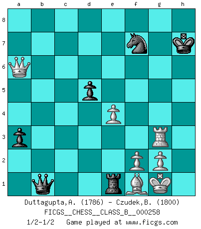Last move : 1/2-1/2 2018 March 24 10:35:10 [Event "FICGS__CHESS__CLASS_B__000258"] [Site "FICGS"] [Date "2017.05.09"] [Round "1"] [White "Duttagupta,Aniruddha"] [Black "Czudek,Bohuslav"] [Result "1/2-1/2"] [WhiteElo "1786"] [BlackElo "1800"] 1.d4 Nf6 2.Bg5 Ne4 3.Bf4 d5 4.e3 c5 5.Bd3 Nf6 6.dxc5 Nc6 7.Nf3 Bg4 8.Bb5 e6 9.b4 a5 10.c3 Nd7 11.a3 g5 12.Bg3 Bg7 13.Ba4 O-O 14.Bd6 Nde5 15.Bxf8 Kxf8 16.b5 Ne7 17.Nbd2 Nd3+ 18.Kf1 Nxc5 19.Bc2 Bxc3 20.Bxh7 Rc8 21.Rb1 f5 22.h4 gxh4 23.Rxh4 Qe8 24.Nb3 Qxb5+ 25.Kg1 Nxb3 26.Rxb3 Qc6 27.Rb1 Bf6 28.Rxg4 fxg4 29.Nd4 Bxd4 30.Qxd4 Qd6 31.Qxg4 Qxa3 32.Rxb7 Qa1+ 33.Kh2 Qf6 34.Bd3 Qh8+ 35.Kg1 Rc1+ 36.Bf1 Qa1 37.Qf3+ Nf5 38.Qe2 Nd6 39.Ra7 Re1 40.Qa6 Nf7 41.Ra8+ Kg7 42.Re8 a4 43.Rxe6 Qb1 44.e4 a3 45.Rg6+ Kh7 46.Rg3 1/2-1/2 Trompowsky attack (Ruth, Opovcensky Opening) Kingside Castling by player Black (move 13) This chess game ended in a draw. Follow this game move after move (download)Chess is a beautiful mistress. (Bent Larsen) Ein unbeabsichtigtes Patt ist der Gipfel der Dummheit. (Anonymous) La señal de un Gran Maestro es su habilidad de ganar una partida rápidamente y sin dolor. (Irving Chernev) RxDa4 pat (...) The difference between perseverance and obstinacy is that one comes from a strong will, and the other from a strong won't. (Henry Ward Beecher)