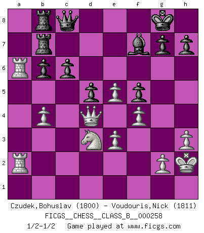 Last move : 1/2-1/2 2017 November 22 19:19:1 [Event "FICGS__CHESS__CLASS_B__000258"] [Site "FICGS"] [Date "2017.05.09"] [Round "1"] [White "Czudek,Bohuslav"] [Black "Voudouris,Nick"] [Result "1/2-1/2"] [WhiteElo "1800"] [BlackElo "1811"] 1.d4 d5 2.c4 e6 3.Nc3 c6 4.Nf3 f5 5.cxd5 exd5 6.Bf4 Bd6 7.Bxd6 Qxd6 8.e3 Nf6 9.Bd3 O-O 10.O-O Ne4 11.Ne5 Be6 12.f3 Nc5 13.f4 Nxd3 14.Qxd3 Nd7 15.Rac1 Qe7 16.Na4 Rac8 17.a3 Nf6 18.Rc2 Ng4 19.Rfc1 b6 20.b4 Nxe5 21.dxe5 Qd7 22.Nb2 Rfe8 23.Qd4 Qb7 24.Nd3 Qd7 25.a4 Rc7 26.a5 Rb8 27.axb6 axb6 28.Ra2 Bf7 29.Ra6 Rcb7 30.Rca1 Qc8 31.h3 Be6 32.Kh2 Bf7 33.R1a2 1/2-1/2 QGD : Semi-Slav Kingside Castling by player Black (move 9) Kingside Castling by player White (move 10) This chess game ended in a draw. Follow this game move after move (download)The blunders are all there on the board, waiting to be made. (Savielly Tartakover) Der Knackpunkt bei der Konzentration ist, daß wir nur durch sie etwas Neues und Ungewöhnliches am Schachbrett finden können. Sie ist der einzige Weg durch neue neue Ideen eine Überraschung zu bereiten. (Garry Kasparov) Dejen al perfeccionista jugar por correo. (Yasser Seirawan) Seul un grand joueur sait à quel point il joue faiblement. (Xavier Tartacover) Control your own destiny or someone else will. (Jack Welch)