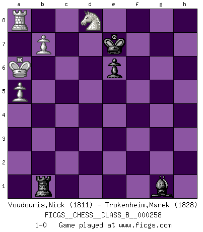 Last move : 1-0 2017 August 6 20:11:55 [Event "FICGS__CHESS__CLASS_B__000258"] [Site "FICGS"] [Date "2017.05.09"] [Round "1"] [White "Voudouris,Nick"] [Black "Trokenheim,Marek"] [Result "1-0"] [WhiteElo "1811"] [BlackElo "1828"] 1.d4 d5 2.e3 Nf6 3.Bd3 e6 4.f4 c6 5.Nf3 Bd6 6.O-O Nbd7 7.b3 O-O 8.Ne5 Ne4 9.Bxe4 dxe4 10.Nd2 f5 11.Ndc4 Nxe5 12.dxe5 Be7 13.Nd6 Qa5 14.Bb2 Rd8 15.Qd4 Qb6 16.Rfd1 Qxd4 17.Rxd4 b6 18.Rad1 Ba6 19.Kf2 g5 20.h3 c5 21.R4d2 Rf8 22.a3 Rab8 23.b4 Bb7 24.bxc5 bxc5 25.a4 gxf4 26.exf4 Bd5 27.Ba3 c4 28.Ke3 c3 29.Rf2 Rb6 30.g4 fxg4 31.Rg2 h5 32.a5 Ra6 33.hxg4 h4 34.Bb4 Rc6 35.Rd4 Rb8 36.Rh2 Bc4 37.Bxc3 Bf1 38.Bb4 h3 39.c3 Rxb4 40.cxb4 Rc3+ 41.Kxe4 Rb3 42.b5 Bh4 43.Rd1 Rb4+ 44.Ke3 Bg3 45.Rc2 Bxf4+ 46.Kf3 Bg2+ 47.Rxg2 hxg2 48.b6 a6 49.Kxg2 Bxe5 50.Kf3 Rf4+ 51.Ke3 Ra4 52.Nb7 Kg7 53.Rd8 Rxg4 54.Ra8 Ra4 55.Rxa6 Kf6 56.Kd3 Bd4 57.Kc2 Be3 58.Kb3 Ra1 59.Kc4 Bf2 60.Kb5 Rb1+ 61.Kc6 Rc1+ 62.Kd7 Ra1 63.Ra7 Rd1+ 64.Kc6 Rc1+ 65.Kb5 Rd1 66.Ra8 Bg1 67.Nd8 Rb1+ 68.Ka6 Ke7 69.b7 1-0 Queen's pawn : Stonewall attack Kingside Castling by player White (move 6) Kingside Castling by player Black (move 7) 10 pieces endgame at move 53 : White KRNPP , Black KRBPP WHITE : King + 1 Rook 1 Knight 2 Pawns BLACK : King + 1 Rook 1 Bishop 2 Pawns 9 pieces endgame at move 55 : White KRNPP , Black KRBP WHITE : King + 1 Rook 1 Knight 2 Pawns BLACK : King + 1 Rook 1 Bishop 1 Pawn Player White won this chess game. Follow this game move after move (download)In blitz, the Knight is stronger than the Bishop. (Vlastimil Hort) Im Leben werden Partien nie so unstrittig gewonnen wie im Spiel (Emanuel Lasker) Por la belleza de sus partidas, la claridad de su juego y lo brillante de sus ideas, Fischer se creó el mismo como un artista de la misma estatura como Brahms, Rembrandt y Shakespeare. (David Levy) L'ordinateur a tué l'originalité. Il n'y a plus guère d'aventures sur l'échiquier. (Jacob Murray) Nothing is more important for teaching us to understand the concepts we have than constructing fictitious ones. (Ludwig Wittgenstein)