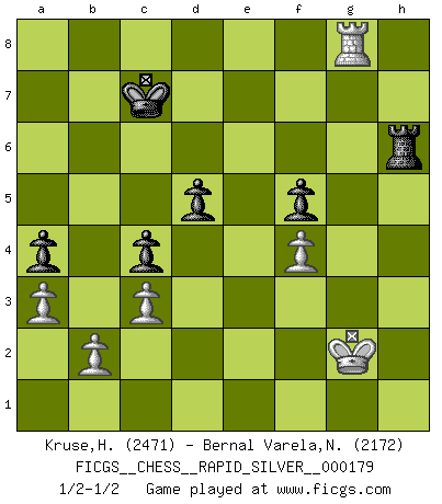 Last move : 1/2-1/2 2017 July 1 6:31:16 [Event "FICGS__CHESS__RAPID_SILVER__000179"] [Site "FICGS"] [Date "2017.05.10"] [Round "1"] [White "Kruse,Herbert"] [Black "Bernal Varela,Nelson"] [Result "1/2-1/2"] [WhiteElo "2471"] [BlackElo "2172"] 1.e4 e6 2.d4 d5 3.Nc3 Nf6 4.e5 Nfd7 5.f4 c5 6.Nf3 Nc6 7.Be3 Be7 8.Qd2 a6 9.dxc5 Nxc5 10.Be2 b5 11.a3 O-O 12.O-O Bb7 13.Nd4 Qc7 14.Nxc6 Qxc6 15.Bd4 f5 16.exf6 Bxf6 17.Bxf6 Rxf6 18.Qd4 Raf8 19.Bd3 Ne4 20.Ne2 Qe8 21.Qe3 Nd6 22.Qb6 Qe7 23.Qc5 h5 24.Rae1 Qd7 25.Rd1 h4 26.h3 Qc6 27.Qxc6 Bxc6 28.Nd4 Bd7 29.Rde1 Nc4 30.Bxc4 bxc4 31.c3 g6 32.Rf3 a5 33.Ref1 Kf7 34.Kh2 Ke7 35.g3 R6f7 36.gxh4 Rh7 37.Kg3 Rfh8 38.Rh1 Rxh4 39.Re3 e5 40.Rxe5+ Kd6 41.Rg5 Rxh3+ 42.Rxh3 Rxh3+ 43.Kg2 Rh6 44.Kf3 a4 45.Kg2 Kc5 46.Re5 Kd6 47.Kf3 Rh1 48.Rg5 Rh3+ 49.Kg2 Rh6 50.Rg3 Bf5 51.Nxf5+ gxf5 52.Rg8 Kc7 53.Rg7+ Kb6 54.Rg8 Kc7 55.Rg7+ Kb6 56.Rg8 Kc7 1/2-1/2 French : Steinitz, Boleslavsky variation Kingside Castling by player Black (move 11) Kingside Castling by player White (move 12) This chess game ended in a draw. Follow this game move after move (download)I have never in my life played the French Defence, which is the dullest of all openings. (Wilhelm Steinitz) Habe Mut, dich deines eigenen Verstandes zu bedienen. (Immanuel Kant) Una mala movida nulifica cuarenta buenas. (Horowitz) Les échecs, c'est l'imagination. (David Bronstein) Memory... is the diary that we all carry with us. (Oscar Wilde, The Importance of Being Earnest)