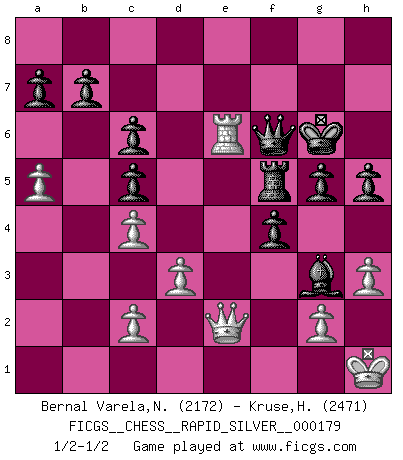 Last move : 1/2-1/2 2017 July 6 15:48:39 [Event "FICGS__CHESS__RAPID_SILVER__000179"] [Site "FICGS"] [Date "2017.05.10"] [Round "2"] [White "Bernal Varela,Nelson"] [Black "Kruse,Herbert"] [Result "1/2-1/2"] [WhiteElo "2172"] [BlackElo "2471"] 1.e4 c5 2.Nf3 Nc6 3.Bb5 g6 4.O-O Bg7 5.Re1 e5 6.Bxc6 dxc6 7.d3 Qe7 8.a4 Nf6 9.Bg5 O-O 10.h3 h6 11.Be3 Rd8 12.Qc1 Kh7 13.Nbd2 Ne8 14.Nc4 Nc7 15.b3 f6 16.Nh2 Ne6 17.f4 exf4 18.Bxf4 Nd4 19.Qd2 Be6 20.Qf2 Rd7 21.Nf3 Nxf3+ 22.Qxf3 Rf8 23.Qg3 Bxc4 24.bxc4 g5 25.Bd2 f5 26.e5 f4 27.Qf3 Qe6 28.Bc3 Re7 29.a5 Kg6 30.Rab1 Rf5 31.Re4 Bxe5 32.Qe2 Qf6 33.Kh1 h5 34.Re1 Bxc3 35.Rxe7 Bxe1 36.Re6 Bg3 1/2-1/2 Sicilian : Nimzovich-Rossolimo attack (with ...g6, without ...d6) Kingside Castling by player White (move 4) Kingside Castling by player Black (move 9) This chess game ended in a draw. Follow this game move after move (download)I feel as if I were a piece in a game of Chess, when my opponent says of it: That piece cannot be moved. (Soren Kierkegaard) Fischer ist das größte Genie, das je vom Schachhimmel heruntergestiegen ist. (Mikhail Nekhemyevich Tal) Alguna parte de un error es siempre correcto. (Savielly Tartakover) À la honte des hommes, on sait que les lois du jeu sont les seules qui soient partout justes, claires, inviolables et exécutées. Pourquoi l'Indien qui a donné les règles du jeu d'échecs est-il obéi de bon gré dans toute la terre, et que les décrétales des papes, par exemple, sont aujourd'hui un objet d'horreur et de mépris ? C'est que l'inventeur des échecs combina tout avec justesse pour la satisfaction des joueurs, et que les papes, dans leurs décrétales, n'eurent en vue que leur seul avantage. L'Indien voulut exercer également l'esprit des hommes et leur donner du plaisir; les papes ont voulu abrutir l'esprit des hommes. Voltaire (Dictionnaire philosophique / Garnier 1967) Animated gif is worth one mega-word. (Unknown)