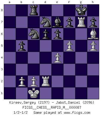 Last move : 1/2-1/2 2017 June 4 21:23:55 [Event "FICGS__CHESS__RAPID_M__000087"] [Site "FICGS"] [Date "2017.05.12"] [Round "1"] [White "Kireev,Sergey"] [Black "Jabot,Daniel"] [Result "1/2-1/2"] [WhiteElo "2197"] [BlackElo "2096"] 1.e4 c5 2.Nf3 d6 3.d4 cxd4 4.Nxd4 Nf6 5.Nc3 a6 6.Be3 e6 7.f3 b5 8.Qd2 Bb7 9.a3 Nbd7 10.g4 Nb6 11.Nb3 Be7 12.g5 Nfd7 13.Na5 Qc7 14.h4 Ne5 15.O-O-O O-O 16.Be2 Rfc8 17.g6 Nxg6 18.h5 Ne5 19.Rhg1 Nbd7 20.Nxb7 Qxb7 21.f4 b4 22.axb4 Nc6 23.f5 Qxb4 24.Bh6 Rab8 25.Bb5 Rxb5 26.Nxb5 Qxd2+ 27.Rxd2 axb5 28.Rxg7+ 1/2-1/2 Sicilian : Najdorf, Byrne (English) attack Queenside Castling by player White (move 15) Kingside Castling by player Black (move 15) This chess game ended in a draw. Follow this game move after move (download)Chess is a sea in which a gnat may drink and an elephant may bathe. (Hindu proverb) Ohne Fehler kann es keine Brillanz geben. (Emanuel Lasker) Bobby es el jugador de Ajedrez mas fino que este país jamás haya producido. Su memoria para las movidas, su brillantez en soñar combinaciones y su feróz determinación por la victoria son algo extraño. (John Collins) Il n'y a plus de joueurs du niveau de Jacob Murray dont la seule quête est le beau jeu, le plaisir de voir les pièces construire quelque chose. Sur 10 idées à la minute, 9 seront sans intérêt, la dernière s'avèrera géniale. (Christian Bauer) Luck is the residue of design. (John Milton)