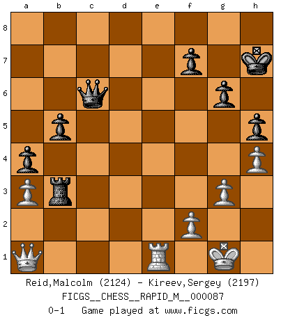 Last move : 0-1 2017 May 30 15:15:32 [Event "FICGS__CHESS__RAPID_M__000087"] [Site "FICGS"] [Date "2017.05.12"] [Round "1"] [White "Reid,Malcolm"] [Black "Kireev,Sergey"] [Result "0-1"] [WhiteElo "2124"] [BlackElo "2197"] 1.Nf3 Nf6 2.b4 d5 3.e3 e5 4.Nxe5 Bxb4 5.Bb2 O-O 6.c4 Nbd7 7.Nf3 Nb6 8.a3 Ba5 9.cxd5 Nbxd5 10.Bc4 Bg4 11.O-O a6 12.Ba2 Re8 13.d3 Qd7 14.h3 Bh5 15.Nbd2 Bxd2 16.Qxd2 Bxf3 17.e4 Re6 18.exd5 Bxd5 19.Bxf6 Rxf6 20.Bxd5 Qxd5 21.Rae1 h6 22.Re7 c5 23.Rfe1 Rd8 24.Qc2 b6 25.R1e3 Rg6 26.g3 Qf5 27.Kg2 Rf6 28.R7e4 Qd5 29.Kg1 Qc6 30.Qc3 Rfd6 31.Rg4 g6 32.Rge4 h5 33.Re7 Rd4 34.h4 a5 35.Ra7 Ra8 36.Rae7 a4 37.Qe1 Rd7 38.Re8+ Kh7 39.R8e5 Rad8 40.Qc3 Rd5 41.Re7 Rf5 42.Qb2 b5 43.Qc3 Rd4 44.Qb2 Rg4 45.Qa2 c4 46.dxc4 Rxc4 47.Re2 Rc1+ 48.Re1 Rxe1+ 49.Rxe1 Rf3 50.Re3 Kg8 51.Re1 Rb3 52.Qa1 Kh7 0-1 Reti Opening Kingside Castling by player Black (move 5) Kingside Castling by player White (move 11) Player Black won this chess game. Follow this game move after move (download)The battle for the ultimate truth will never be won. And that's why Chess is so fascinating. (Hans Kmoch) Auf jeden Fall musst du zuerst Rechtsanwalt werden, damit du deine eigenen Interessen und die deiner Familie vertreten kannst. [Brief an seinen Sohn] (José Raúl Capablanca) Si el ingenio solamente fuese necesario para lucirse, las mujeres serían las mejores jugadoras de Ajedrez del mundo. (Albin) Karpov est une pièce de musée. (Garry Kasparov) Luck is when opportunity knocks and you answer. (Anonymous)