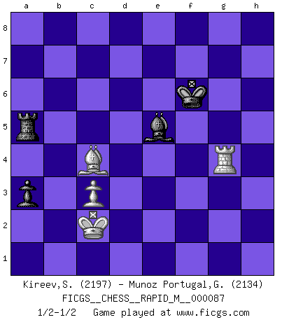 Last move : 1/2-1/2 2017 August 14 9:44:35 [Event "FICGS__CHESS__RAPID_M__000087"] [Site "FICGS"] [Date "2017.05.12"] [Round "1"] [White "Kireev,Sergey"] [Black "Munoz Portugal,Guillermo"] [Result "1/2-1/2"] [WhiteElo "2197"] [BlackElo "2134"] 1.e4 c5 2.Nf3 d6 3.d4 cxd4 4.Nxd4 Nf6 5.Nc3 a6 6.Be3 e5 7.Nb3 Ng4 8.Bd2 Nf6 9.Bg5 Be6 10.f4 exf4 11.Bxf4 Nc6 12.Nd4 Qb6 13.Nxe6 fxe6 14.Qd3 Qxb2 15.Rb1 Qa3 16.Rxb7 Nd7 17.Be2 Nc5 18.Qc4 Be7 19.O-O O-O 20.Rc7 Rxf4 21.Rxf4 Ne5 22.Qd4 Bd8 23.Rf8+ Kxf8 24.Qxd6+ Kg8 25.Rxc5 Nf7 26.Qc6 g6 27.Nd1 Ra7 28.Rc3 Qxa2 29.Rf3 Re7 30.Rf1 a5 31.Ne3 Qb2 32.Kh1 Qb4 33.Bd3 Qb6 34.Qxb6 Bxb6 35.Nc4 Bd8 36.Ra1 Ra7 37.g3 Kg7 38.Kg2 Bc7 39.Kf3 Kf6 40.Ke3 Ne5 41.Nxe5 Kxe5 42.Rb1 a4 43.Bc4 Ra5 44.Ba2 Kd6 45.Rb7 a3 46.Kd3 Kc6 47.Rb1 Kd7 48.Rb3 g5 49.Ke3 g4 50.Kd3 Kc6 51.Rb4 h5 52.Rb1 Be5 53.c3 Kd7 54.Rb6 Bd6 55.Kc2 Re5 56.Kd3 Bc5 57.Rb5 Kd6 58.Rb1 Ba7 59.Bc4 Ra5 60.Ba2 Ke5 61.Ke2 Kxe4 62.Bxe6 Ke5 63.Bc4 Kf6 64.Ra1 Bb8 65.Kd3 h4 66.Kc2 hxg3 67.hxg3 Bxg3 68.Rg1 Be5 69.Rxg4 1/2-1/2 Sicilian : Najdorf, Byrne (English) attack Kingside Castling by player White (move 19) Kingside Castling by player Black (move 19) 10 pieces endgame at move 67 : White KRBPP , Black KRBPP WHITE : King + 1 Rook 1 Bishop 2 Pawns BLACK : King + 1 Rook 1 Bishop 2 Pawns 9 pieces endgame at move 67 : White KRBP , Black KRBPP WHITE : King + 1 Rook 1 Bishop 1 Pawn BLACK : King + 1 Rook 1 Bishop 2 Pawns 8 pieces endgame at move 69 : White KRBP , Black KRBP WHITE : King + 1 Rook 1 Bishop 1 Pawn BLACK : King + 1 Rook 1 Bishop 1 Pawn This chess game ended in a draw. Follow this game move after move (download)My opponents make good moves too. Sometimes I don't take these things into consideration. (Bobby Fischer) Wie gewinnt Tal? Er entwickelt alle seine Figuren in die Brettmitte und opfert sie dann irgendwo. (Robert James Fischer) Tu sabes, camarada Pachman, no disfruto el ser un Ministro, preferería jugar al Ajedrez como tu. (Che Guevara) La vie est comme un jeu d'échecs : nous esquissons un plan, mais celui-ci est tributaire de ce que daignent faire l'adversaire aux échecs et le destin dans la vie. (Arthur Schopenhauer) Only sick music makes money today. (Friedrich Nietzsche)