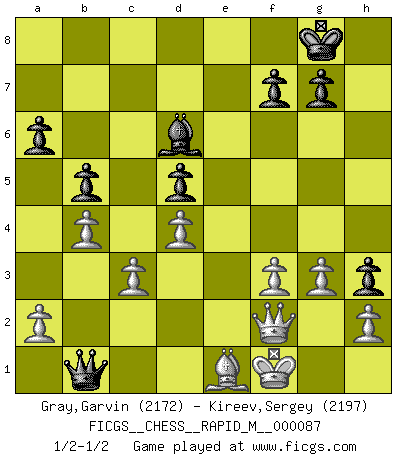 Last move : 1/2-1/2 2017 May 21 17:22:17 [Event "FICGS__CHESS__RAPID_M__000087"] [Site "FICGS"] [Date "2017.05.12"] [Round "1"] [White "Gray,Garvin"] [Black "Kireev,Sergey"] [Result "1/2-1/2"] [WhiteElo "2172"] [BlackElo "2197"] 1.e4 e5 2.Nf3 Nc6 3.Bb5 a6 4.Ba4 Nf6 5.O-O Be7 6.Re1 b5 7.Bb3 O-O 8.c3 d5 9.exd5 Nxd5 10.Nxe5 Nxe5 11.Rxe5 c6 12.d4 Bd6 13.Re1 Qh4 14.g3 Qh3 15.Qe2 Bg4 16.Qf1 Qh5 17.Nd2 Rae8 18.Rxe8 Rxe8 19.f3 Bh3 20.Qf2 Bf5 21.Nf1 Qg6 22.Bxd5 cxd5 23.Ne3 h5 24.Nxf5 Qxf5 25.Bd2 h4 26.Re1 Rxe1+ 27.Bxe1 h3 28.Kf1 Qb1 29.b4 1/2-1/2 Ruy Lopez : Closed, 7...O-O Kingside Castling by player White (move 5) Kingside Castling by player Black (move 7) This chess game ended in a draw. Follow this game move after move (download)The essence of Chess is thinking about what Chess is. (David Bronstein) Dass jemand wie Surab Asmaiparaschwili, der selbst Elopunkte gekauft hat , Vize-Präsident der Fide werden konnte, sagt schon einges über den Zustand dieser Organisation aus. (Joel Lautier) Una de estas pequeñas movidas modestas pudieran ser mas molestas a tu oponente que la amenaza mas grande. (Siegbert Tarrasch) Aucun coup ne doit être joué sans but. (Pedro Damiano) When it is a question of money, everybody is of the same religion. (Voltaire)