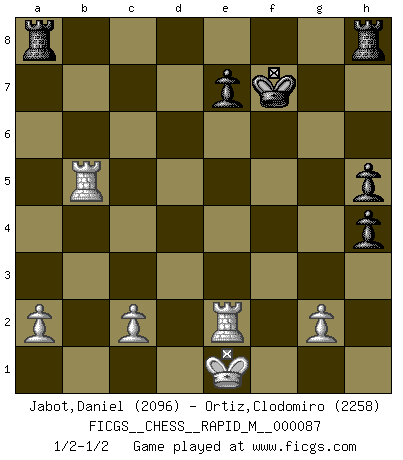 Last move : 1/2-1/2 2017 July 3 12:19:5 [Event "FICGS__CHESS__RAPID_M__000087"] [Site "FICGS"] [Date "2017.05.12"] [Round "1"] [White "Jabot,Daniel"] [Black "Ortiz,Clodomiro"] [Result "1/2-1/2"] [WhiteElo "2096"] [BlackElo "2258"] 1.e4 g6 2.d4 Bg7 3.Nc3 d6 4.Be3 a6 5.f4 b5 6.Bd3 Nd7 7.Nf3 Bb7 8.e5 c5 9.Be4 Bxe4 10.Nxe4 Nh6 11.dxc5 Ng4 12.Bg1 dxe5 13.h3 Ngf6 14.c6 Nxe4 15.cxd7+ Qxd7 16.Qxd7+ Kxd7 17.fxe5 Ng3 18.Rh2 Bh6 19.Rd1+ Ke8 20.h4 Bf4 21.Rd4 Bc1 22.Rb4 h5 23.Rh3 Nf5 24.Nd4 Rd8 25.Ra3 Bxb2 26.Rxb2 Nxd4 27.Rxa6 Nf5 28.Bf2 g5 29.Rxb5 Nxh4 30.Bxh4 gxh4 31.e6 fxe6 32.Rxe6 Ra8 33.Re2 Kf7 1/2-1/2 Robatsch (Modern) defense This chess game ended in a draw. Follow this game move after move (download)For surely of all the drugs in the world, Chess must be the most permanently pleasurable. (Assiac) Ein Schachspiel besteht aus drei Phasen: Die erste, wenn du hofftst den Vorteil zu haben, die zweite, wenn du glaubst einen Vorteil zu haben, und die dritte.... wenn du weißt Du wirst verlieren. (Savielly Grigorievitsch Tartakower) El Ajedrez es como la guerra en un tablero. (Bobby Fischer) Mais n'est-ce pas déjà le limiter injurieusement que d'appeler les échecs un jeu? N'est-ce pas aussi une science, un art, ou quelque chose qui, comme le cercueil de Mahomet entre ciel et terre, est suspendu entre l'un et l'autre, et qui réunit un nombre incroyable de contraires ? (Stefan Zweig) After growing wildly for years, the field of computing appears to be reaching its infancy. (John Pierce)