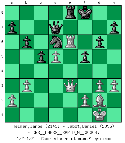 Last move : 1/2-1/2 2017 August 13 3:5:9 [Event "FICGS__CHESS__RAPID_M__000087"] [Site "FICGS"] [Date "2017.05.12"] [Round "1"] [White "Helmer,Janos"] [Black "Jabot,Daniel"] [Result "1/2-1/2"] [WhiteElo "2145"] [BlackElo "2096"] 1.c4 Nf6 2.Nc3 e5 3.Nf3 Nc6 4.g3 d5 5.cxd5 Nxd5 6.Bg2 Nb6 7.O-O Be7 8.d3 O-O 9.Be3 Re8 10.Rc1 Bf8 11.d4 exd4 12.Nxd4 Nxd4 13.Bxd4 c6 14.e4 Be6 15.b3 Qe7 16.Qc2 Rad8 17.Rfd1 g6 18.Be3 Nd7 19.Ne2 Ne5 20.h3 c5 21.Nf4 b6 22.Rxd8 Rxd8 23.Nd5 Bxd5 24.exd5 f5 25.Bf4 Nf7 26.Qd3 Qd7 27.Re1 Bd6 28.Bxd6 Nxd6 29.Re6 Re8 30.Qe3 Kf8 1/2-1/2 English Opening Kingside Castling by player White (move 7) Kingside Castling by player Black (move 8) This chess game ended in a draw. Follow this game move after move (download)A Chess game is divided into three stages: the first, when you hope you have the advantage, the second when you believe you have an advantage, and the third... when you know you're going to lose ! (Savielly Tartakower) Wenn du gegen Bobby spielst, ist es keine Frage von gewinnen oder verlieren. Es ist eine Frage des Überlebens. (Boris Vassilievich Spassky) Yo adoro todas la posiciones. Denme una partida posicional difícil, y la jugaré. Pero posiciones totalmente ganadas, no las tolero. (Hein Donner) Pour se monter efficace, un Cavalier a besoin d'avant-postes ! Les Cavaliers font les meilleurs bloqueurs de pions passés. True nature is revealed in times of difficulty. (Chinese proverb)