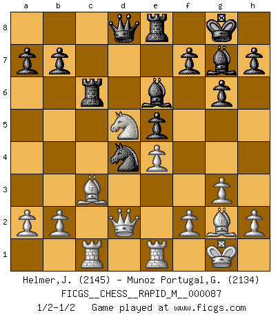 Last move : 1/2-1/2 2017 June 18 0:8:14 [Event "FICGS__CHESS__RAPID_M__000087"] [Site "FICGS"] [Date "2017.05.12"] [Round "1"] [White "Helmer,Janos"] [Black "Munoz Portugal,Guillermo"] [Result "1/2-1/2"] [WhiteElo "2145"] [BlackElo "2134"] 1.Nf3 c5 2.c4 Nf6 3.Nc3 g6 4.g3 d5 5.cxd5 Nxd5 6.Bg2 Bg7 7.O-O Nc6 8.d4 cxd4 9.Nxd4 Nxd4 10.Nxd5 Bg4 11.Re1 e5 12.Bd2 O-O 13.Bc3 Re8 14.Qd2 Rc8 15.e4 Be6 16.Rad1 Nb5 17.Bb4 Nd4 18.Rc1 Rc6 19.Bc3 1/2-1/2 Reti Opening Kingside Castling by player White (move 7) Kingside Castling by player Black (move 12) This chess game ended in a draw. Follow this game move after move (download)Pawns: they are the soul of this game, they alone form the attack and defense. (Philidor) Stil? Ich habe keinen Stil! (Anatoly Karpov) Buenas posiciones no logran ganar juegos, buenas movidas sí. (Gerald Abrahams) Les Echecs représentent une sphère d'idées créatrices basée sur la volonté des deux protagonistes. (Smyslov) Never risk one's whole fortune unless supported by one's entire army. (Niccolo Machiavelli)