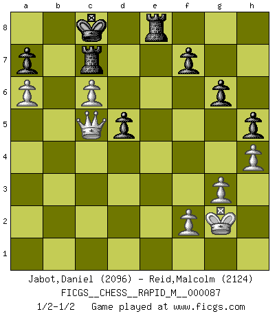 Last move : 1/2-1/2 2017 July 31 19:11:46 [Event "FICGS__CHESS__RAPID_M__000087"] [Site "FICGS"] [Date "2017.05.12"] [Round "1"] [White "Jabot,Daniel"] [Black "Reid,Malcolm"] [Result "1/2-1/2"] [WhiteElo "2096"] [BlackElo "2124"] 1.e4 d5 2.exd5 Qxd5 3.Nf3 Bg4 4.Be2 Nc6 5.d4 O-O-O 6.c4 Qf5 7.Be3 Bxf3 8.Bxf3 Nxd4 9.Bxd4 Qe6+ 10.Be2 Qe4 11.O-O Qxd4 12.Qa4 e6 13.Nc3 Bd6 14.Nb5 Qe5 15.Nxd6+ cxd6 16.Bf3 Kb8 17.Rfe1 Qc5 18.b4 Qc7 19.c5 Ne7 20.Rac1 dxc5 21.bxc5 Ka8 22.Rb1 Nd5 23.Rb5 Rc8 24.Reb1 Rhd8 25.g3 g6 26.Rxb7 Qxb7 27.Rxb7 Kxb7 28.Qb5+ Ka8 29.a4 Rc7 30.a5 Rb7 31.Qa4 Rbd7 32.Qb3 Rb7 33.Qc4 Kb8 34.Qh4 Rh8 35.a6 Rd7 36.Qa4 Rhd8 37.Kf1 Rc7 38.Qh4 R8d7 39.Qd4 Rd8 40.h4 h5 41.Bxd5 exd5 42.Qb4+ Kc8 43.c6 Re8 44.Qd4 Rce7 45.Kg2 Rc7 46.Qc5 1/2-1/2 Scandinavian (centre counter) defense Queenside Castling by player Black (move 5) Kingside Castling by player White (move 11) This chess game ended in a draw. Follow this game move after move (download)It began to feel as though you were playing against Chess itself. - On playing against Robert Fischer. (Walter Shipman) Weshalb minderdergeübte Spieler mit g2-g4 beginnen? Die betreffenden sind unschlüssig, ob sie nun rechts (h4) oder links (f4) beginnen sollen, und in ihrer Ratlosigkeit entschliessen sie sich nach guter Bürgerart dazu, den goldenen Mittelweg zu wählen. (Aaron Nimzowitsch) Peones: ellos son el alma de esta partida, solos forman el ataque y la defensa. (Philidor) L'ordinateur a tué l'originalité. Il n'y a plus guère d'aventures sur l'échiquier. (Jacob Murray) Better than a thousand days of diligent study is one day with a great teacher. (Japanese proverb)