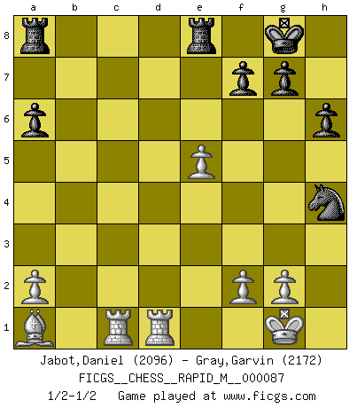 Last move : 1/2-1/2 2017 August 4 19:21:10 [Event "FICGS__CHESS__RAPID_M__000087"] [Site "FICGS"] [Date "2017.05.12"] [Round "1"] [White "Jabot,Daniel"] [Black "Gray,Garvin"] [Result "1/2-1/2"] [WhiteElo "2096"] [BlackElo "2172"] 1.e4 c6 2.d4 d5 3.e5 Bf5 4.Nf3 e6 5.Be2 Ne7 6.O-O c5 7.c4 Nbc6 8.Na3 a6 9.dxc5 d4 10.Qa4 Ng6 11.Rd1 Bxc5 12.b4 Ba7 13.c5 O-O 14.Nc4 d3 15.Bg5 Qd5 16.Ne3 Qe4 17.Bxd3 Qxb4 18.Qxb4 Nxb4 19.Bxf5 exf5 20.h4 Rfe8 21.Nxf5 h6 22.Bd2 Bxc5 23.Nd6 Re7 24.Ne4 b6 25.Nxc5 bxc5 26.Bc3 Nc2 27.Rac1 Nd4 28.Nxd4 cxd4 29.Bxd4 Nxh4 30.Ba1 R7e8 1/2-1/2 Caro-Kann : Advance variation Kingside Castling by player White (move 6) Kingside Castling by player Black (move 13) This chess game ended in a draw. Follow this game move after move (download)If one piece is badly posted, the whole game is bad. (Tarrasch) Frage: Was machen Sie mit den Preisen? Anwort: Ich habe Angst, dass meine Freundin davon neue Kleider kauft. (Loek van Wely) Después de una mala apertura, hay una esperanza en el juego medio. Pero una vez que estas en finales, el momento de la verdad ha llegado. (Edmar Mednis) 'L'échange des dames est un coup dur pour les deux adversaires...' Un journaliste lors d'une partie du match Spassky-Fischer Now you put water in a cup, it becomes the cup; You put water into a bottle it becomes the bottle; You put it in a teapot it becomes the teapot. Water can flow or it can crash. Be water, my friend. (Bruce Lee)