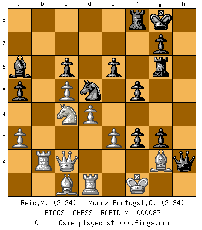 Last move : 0-1 2017 June 18 12:45:37 [Event "FICGS__CHESS__RAPID_M__000087"] [Site "FICGS"] [Date "2017.05.12"] [Round "1"] [White "Reid,Malcolm"] [Black "Munoz Portugal,Guillermo"] [Result "0-1"] [WhiteElo "2124"] [BlackElo "2134"] 1.Nf3 Nf6 2.b4 d5 3.e3 Nb8d7 4.Bb2 e6 5.a3 a5 6.b5 Bd6 7.c4 O-O 8.d4 c5 9.bxc6 bxc6 10.c5 Rb8 11.Qc2 Bc7 12.Nbd2 Ne4 13.Nxe4 dxe4 14.Nd2 f5 15.Be2 Qg5 16.O-O Nf6 17.Rfb1 Ra8 18.Re1 Nd5 19.Nc4 Ba6 20.Bf1 Bxh2 21.Kxh2 Rf6 22.Kg1 Rh6 23.g3 Qh5 24.Bg2 Qh2 25.Kf1 Rg6 26.Bc1 h5 27.Rb1 h4 28.Rb2 Rf8 29.Rd1 hxg3 30.f4 exf3 0-1 Reti Opening Kingside Castling by player Black (move 7) Kingside Castling by player White (move 16) Player Black won this chess game. Follow this game move after move (download)Chess demands total concentration. (Bobby Fischer) Wenn ich Weiß habe gewinne ich weil ich Weiß habe, wenn ich Schwarz habe gewinne ich weil ich Bogoljubov bin. (Efim Bogoljubov) Creo que una cierta cantidad de temperamento es esperada de los genios del Ajedrez. (Ron Gross) On entre au jeu d'Echecs comme on entre en Religion. Pour le joueur d'Echecs, la partie d'Echecs c'est l'office, la messe, le défilé du 1er Mai, le dépôt de gerbe au Monument aux Morts. C'est un drame sacré. (Michel Roos) All politicians must be presumed guilty until they are proven innocent. (Dinesh De Silva)