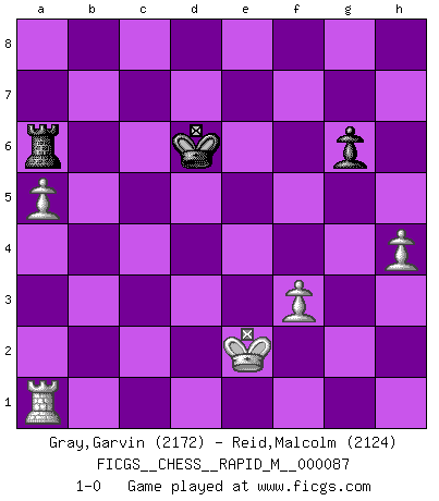 Last move : 1-0 2017 August 21 18:10:26 [Event "FICGS__CHESS__RAPID_M__000087"] [Site "FICGS"] [Date "2017.05.12"] [Round "1"] [White "Gray,Garvin"] [Black "Reid,Malcolm"] [Result "1-0"] [WhiteElo "2172"] [BlackElo "2124"] 1.e4 d5 2.exd5 Qxd5 3.Nc3 Qd6 4.d4 Nf6 5.Nf3 a6 6.g3 Bg4 7.h3 Bh5 8.Bf4 Qb4 9.g4 Bg6 10.Qc1 Qb6 11.Bg2 e6 12.O-O Nbd7 13.Rd1 Rd8 14.Nd2 Bd6 15.Nc4 Qb4 16.Nxd6+ cxd6 17.Qd2 O-O 18.g5 Nh5 19.Nd5 Qxd2 20.Ne7+ Kh8 21.Nxg6+ hxg6 22.Bxd2 d5 23.c4 Nb6 24.b3 Rd7 25.Rdc1 Nc8 26.cxd5 exd5 27.Rc5 Ne7 28.Rac1 f6 29.h4 Kh7 30.Rc7 Rfd8 31.Bh3 Nf5 32.Kf1 Rxc7 33.Rxc7 b5 34.Bxf5 gxf5 35.Rc6 Ra8 36.f3 Kg6 37.Rd6 f4 38.Kf2 Kf5 39.Rxd5+ Ke6 40.Rc5 Rd8 41.Rc6+ Kf5 42.gxf6 Nxf6 43.Rxa6 Rxd4 44.Ke2 Rd5 45.a4 bxa4 46.bxa4 Rd8 47.Ra5+ Nd5 48.Rb5 Ke6 49.a5 Rd6 50.Rc5 g6 51.Rc4 Ra6 52.Kd3 Kd6 53.Rc1 Ne3 54.Bxe3 fxe3 55.Ra1 e2 56.Kxe2 1-0 Scandinavian : Pytel-Wade variation Kingside Castling by player White (move 12) Kingside Castling by player Black (move 17) 10 pieces endgame at move 54 : White KRBPPP , Black KRPP WHITE : King + 1 Rook 1 Bishop 3 Pawns BLACK : King + 1 Rook 2 Pawns 9 pieces endgame at move 54 : White KRPPP , Black KRPP WHITE : King + 1 Rook 3 Pawns BLACK : King + 1 Rook 2 Pawns 8 pieces endgame at move 56 : White KRPPP , Black KRP WHITE : King + 1 Rook 3 Pawns BLACK : King + 1 Rook 1 Pawn Player White won this chess game. Follow this game move after move (download)A good player is always lucky. (Jose Raul Capablanca) Modernes Schach erfordert enorme Anspannung. Es ist für einen normalen Menschen unmöglich das auszuhalten. (Viktor Kortschnoi) La táctica fluye a partir de una posición superior. (Bobby Fischer) Toute estimation doit être constamment réévaluée. (Jacob Estrin) Drag your thoughts away from your troubles... by the ears, by the heels, or any other way you can manage it. (Mark Twain)