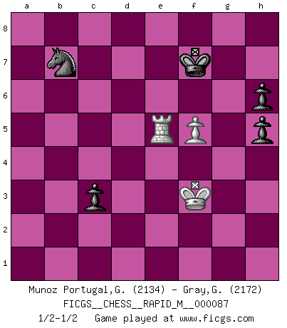 Last move : 1/2-1/2 2017 September 9 8:36:40 [Event "FICGS__CHESS__RAPID_M__000087"] [Site "FICGS"] [Date "2017.05.12"] [Round "1"] [White "Munoz Portugal,Guillermo"] [Black "Gray,Garvin"] [Result "1/2-1/2"] [WhiteElo "2134"] [BlackElo "2172"] 1.d4 Nf6 2.c4 e6 3.Nf3 c5 4.d5 exd5 5.cxd5 d6 6.Nc3 g6 7.e4 a6 8.Be2 Bg7 9.a4 Bg4 10.O-O Nbd7 11.Bf4 Qe7 12.Nd2 Bxe2 13.Qxe2 Nh5 14.Be3 Bd4 15.Ra1e1 O-O 16.f4 Rfe8 17.Qd3 Bg7 18.g4 Bxc3 19.bxc3 Nhf6 20.g5 Nxe4 21.Bd4 Qf8 22.Nxe4 cxd4 23.Qxd4 b5 24.Rf3 bxa4 25.Rfe3 Red8 26.h4 a3 27.c4 a5 28.h5 gxh5 29.Rxa3 a4 30.Ng3 Qg7 31.Qd2 Re8 32.Nf5 Qg6 33.Ne7 Rxe7 34.Rxe7 Qf5 35.Kh2 Nc5 36.Re2 Kg7 37.Qe3 Kg6 38.Qd4 Nb3 39.Qe4 Qxe4 40.Rxe4 Nd2 41.Rd4 Nb1 42.Ra1 Nc3 43.Kh3 Rb8 44.Re1 a3 45.c5 dxc5 46.Rd2 a2 47.d6 Ne4 48.Rxa2 Rb3+ 49.Kg2 Nxd6 50.Re5 c4 51.Ra8 Kg7 52.f5 h6 53.g6 Rb2+ 54.Kf3 c3 55.gxf7 Kxf7 56.Ra7 Rb7 57.Rxb7 Nxb7 1/2-1/2 Queen's pawn game Kingside Castling by player White (move 10) Kingside Castling by player Black (move 15) 10 pieces endgame at move 55 : White KRRP , Black KRNPPP WHITE : King + 2 Rooks 1 Pawn BLACK : King + 1 Rook 1 Knight 3 Pawns 9 pieces endgame at move 57 : White KRRP , Black KNPPP WHITE : King + 2 Rooks 1 Pawn BLACK : King + 1 Knight 3 Pawns 8 pieces endgame at move 57 : White KRP , Black KNPPP WHITE : King + 1 Rook 1 Pawn BLACK : King + 1 Knight 3 Pawns This chess game ended in a draw. Follow this game move after move (download)Chess is above all, a fight ! (Emanuel Lasker) Im Hotelzimmer gab es nur zwei Schaben. (Über die Turnierbedingungen) (Peter Swidler) Una buena memoria, concentración, imaginación y una fuerte voluntad, se requiere para llegar a ser un buen jugador. (Bobby Fischer) Ce n'est pas pour s'amuser qu'il joue aux échecs : il célèbre un culte. (Vladimir Nabokov) The greatest con, that he ever pulled... was making you believe... that he is you. (Revolver, movie)