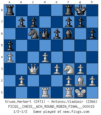 Last move : 1/2-1/2 2017 June 2 4:11:31 [Event "FICGS__CHESS__WCH_ROUND_ROBIN_FINAL__000015"] [Site "FICGS"] [Date "2017.05.12"] [Round "1"] [White "Kruse,Herbert"] [Black "Antonov,Vladimir"] [Result "1/2-1/2"] [WhiteElo "2471"] [BlackElo "2366"] 1.Nf3 Nf6 2.g3 d5 3.Bg2 e6 4.O-O Be7 5.d4 O-O 6.c4 dxc4 7.Qc2 a6 8.a4 Bd7 9.Qxc4 Bc6 10.Bg5 Bd5 11.Qc2 Be4 12.Qc1 h6 13.Bxf6 Bxf6 14.Nbd2 Bxf3 15.Nxf3 a5 16.Qc3 Nc6 17.Rad1 Qd6 18.e3 1/2-1/2 Reti Opening Kingside Castling by player White (move 4) Kingside Castling by player Black (move 5) This chess game ended in a draw. Follow this game move after move (download)Up to this point White has been following well-known analysis. But now he makes a fatal error: he begins to use his own head. (Siegbert Tarrasch) Wir irren allesamt, nur jeder irrt anders. (Georg Christoph Lichtenberg) Hay jugadores fuertes y personas amables y yo soy un jugador fuerte. (Bobby Fischer) Votre prénom est 'Tactique', votre deuxième prénom est 'Tactique' et votre nom est 'Tactique'. (Ken Smith) I'm extremely disappointed. I send you out for exciting, new designer drugs, you come back with tomato sauce. (Gregory House, House M.D.)