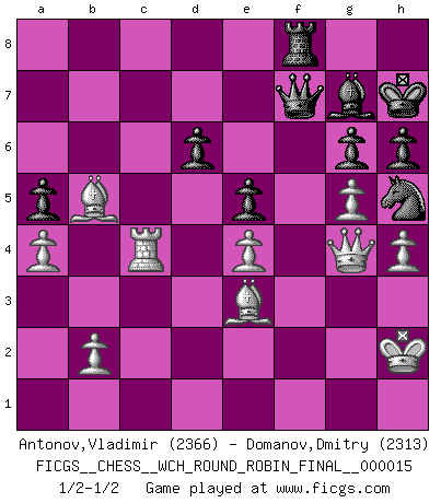 Last move : 1/2-1/2 2017 August 28 0:59:46 [Event "FICGS__CHESS__WCH_ROUND_ROBIN_FINAL__000015"] [Site "FICGS"] [Date "2017.05.12"] [Round "1"] [White "Antonov,Vladimir"] [Black "Domanov,Dmitry"] [Result "1/2-1/2"] [WhiteElo "2366"] [BlackElo "2313"] 1.d4 Nf6 2.c4 g6 3.Nc3 Bg7 4.e4 O-O 5.Nf3 d6 6.Be2 e5 7.O-O Nc6 8.d5 Ne7 9.Ne1 Nd7 10.f3 f5 11.g4 Nf6 12.Nd3 h6 13.h4 c6 14.Be3 b5 15.Nb4 cxd5 16.cxd5 Bd7 17.Rc1 a5 18.Nc6 Nxc6 19.dxc6 Bxc6 20.Nxb5 Bxb5 21.Bxb5 fxg4 22.fxg4 Rb8 23.a4 Kh7 24.Rc4 Qe7 25.g5 Nh5 26.Rxf8 Rxf8 27.Qg4 Qf7 28.Kh2 1/2-1/2 King's Indian : 4.e4 Kingside Castling by player Black (move 4) Kingside Castling by player White (move 7) This chess game ended in a draw. Follow this game move after move (download)I give 98 percent of my mental energy to Chess. Others give only 2 percent. (Bobby Fischer) Wenn sie aufgeben, dann danke ich Ihnen für das Spiel (Eventualzug beim Fernschach). (Anonymous) La pasion por jugar al Ajedrez es una de las mas inexplicables en el mundo. (H.G. Wells) Les erreurs sont comme les malheurs, elles n'arrivent jamais seules. (Siegbert Tarrasch) They misunderestimated me. (George W. Bush, Bentonville nov. 6, 2000)