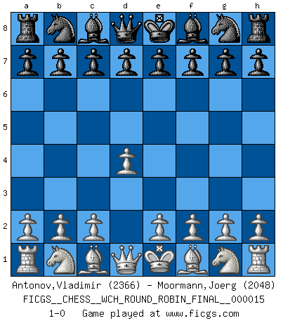 Last move : 1-0 2017 June 12 8:59:9 [Event "FICGS__CHESS__WCH_ROUND_ROBIN_FINAL__000015"] [Site "FICGS"] [Date "2017.05.12"] [Round "1"] [White "Antonov,Vladimir"] [Black "Moormann,Joerg"] [Result "1-0"] [WhiteElo "2366"] [BlackElo "2048"] 1.d4 1-0 This chess game has been lost on time (started : 2017.05.12 23:36:43) Queen's pawn Player White won this chess game. Follow this game move after move (download)A chess genius has died; a loss for humanity. (Viktor Kortchnoi, about Bobby Fischer's death) Ich war zu klein für die Schach-Schülermannschaft! (Woody Allen) Cuando veas una buena jugada, trata de encontrar otra mejor. (Emanuel Lasker) Toutes les manuvres exécutées sur une colonne ouverte ont pour but ultime l'intrusion définitive sur la septième ou la huitième rangée, en plein cur de la position ennemie. (Aaron Nimzovitch) The human is the only animal species whose members are able to talk themselves into difficulties that would not otherwise exist. (Wendell Johnson)
