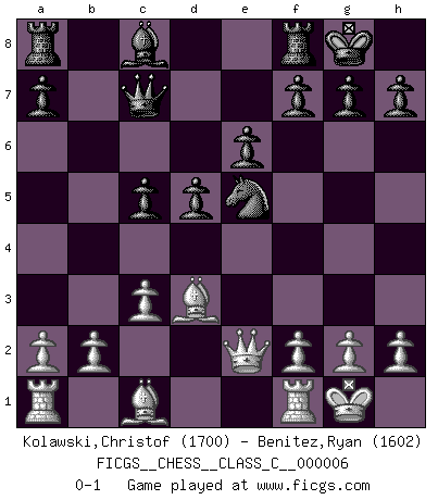 Last move : 0-1 2006 September 28 21:55:48 [Event "FICGS__CHESS__CLASS_C__000006"] [Site "FICGS"] [Date "2006.05.31"] [Round "1"] [White "Kolawski,Christof"] [Black "Benitez,Ryan"] [Result "0-1"] [WhiteElo "1700"] [BlackElo "1602"] 1.d4 Nf6 2.Nf3 d5 3.e3 e6 4.Bd3 c5 5.c3 Bd6 6.Nbd2 Nc6 7.O-O O-O 8.dxc5 Bxc5 9.e4 Qc7 10.Qe2 b6 11.e5 Ng4 12.Nb3 Ncxe5 13.Nxe5 Nxe5 14.Nxc5 bxc5 0-1 This chess game has been lost on time (started : 2006.05.31 8:2:36) Queen's pawn game Kingside Castling by player White (move 7) Kingside Castling by player Black (move 7) Player Black won this chess game. Follow this game move after move (download)Not all artists are Chess players, but all Chess players are artists. (Marcel Duchamp) Ich rechne überhaupt nicht voraus. Ich gewinne auch so. (Robert James Fischer) Por esta medida (el intervalo entre Fischer y sus contemporaneos), yo le considero el mas grande campeón mundial. (Garry Kasparov) L'action d'une oeuvre littéraire se déroule sur un champ de bataille. Les masques et les types du drame moderne correspondent aux pièces du jeu d'échecs. L'intrigue correspond aux coups et aux gambits, c'est à dire aux techniques du jeu telles qu'utilisées et interprétées par les joueurs. Les tactiques et les péripéties [mouvements] correspondent aux coups exécutés par l'adversaire. (Viktor Shklovsky) The mind is like a parachute, it only functions when its open. (Unknown)