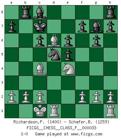 Last move : 1-0 2007 April 18 0:56:59 [Event "FICGS__CHESS__CLASS_F__000033"] [Site "FICGS"] [Date "2007.04.08"] [Round "1"] [White "Richardson,Patrick"] [Black "Schafer,Banner"] [Result "1-0"] [WhiteElo "1400"] [BlackElo "1259"] 1.e4 c5 2.Nf3 Nc6 3.d4 cxd4 4.Nxd4 g6 5.Nc3 Bg7 6.Be3 d6 7.Be2 Nf6 8.Nxc6 bxc6 9.e5 dxe5 10.Qxd8+ Kxd8 11.O-O-O Kc7 12.Bc4 e6 13.Bc5 Nd5 14.Ne4 Rb8 15.Bd6+ 1-0 Sicilian : Accelerated Fianchetto, Modern variation Queenside Castling by player White (move 11) Player White won this chess game. Follow this game move after move (download)When your house is on fire, you can't be bothered with the neighbors. Or, as we say in Chess, if your King is under attack you don't worry about losing a Pawn on the Queen's side. (Gary Kasparov) Viele Opfer benötigen überhaupt keine konkrete Berechnung. Es genügt sich die entstehende Position kurz vorzustellen, um uns davon zu überzeugen, dass das Opfer korrekt ist. (Mikhail Nekhemyevich Tal) El Ajedrez es un mar en el cual un mosquito puede beber y un elefante puede bañarse. (Refrán Hindú) Les échecs sont un jeu par leur forme, un art par leur essence et une science par sa difficulté d'acquisition. Ils peuvent vous procurer autant de plaisir qu'un bon livre ou une belle musique, mais vous n'aurez une réelle joie que si vous arrivez à bien jouer. (Tigran Petrosian) Wisdom doesn't necessarily come with age. Sometimes age just shows up all by itself. (Tom Wilson)