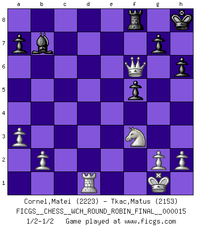 Last move : 1/2-1/2 2017 September 10 18:54:13 [Event "FICGS__CHESS__WCH_ROUND_ROBIN_FINAL__000015"] [Site "FICGS"] [Date "2017.05.12"] [Round "1"] [White "Cornel,Matei"] [Black "Tkac,Matus"] [Result "1/2-1/2"] [WhiteElo "2223"] [BlackElo "2153"] 1.e4 e5 2.Nf3 Nf6 3.Nxe5 d6 4.Nf3 Nxe4 5.d4 d5 6.Bd3 Bd6 7.O-O O-O 8.c4 c6 9.Qc2 Na6 10.a3 f5 11.Nc3 Nc7 12.Be3 Kh8 13.Rae1 b6 14.c5 bxc5 15.dxc5 Bxc5 16.Bxe4 Bxe3 17.Bxd5 Bxf2+ 18.Qxf2 Nxd5 19.Nxd5 cxd5 20.Re5 Ba6 21.Rd1 Qf6 22.Rexd5 Bb7 23.Rd6 Rad8 24.Qd4 Rxd6 25.Qxd6 h6 26.Qxf6 1/2-1/2 Petrov : Classical attack, Marshall variation Kingside Castling by player White (move 7) Kingside Castling by player Black (move 7) This chess game ended in a draw. Follow this game move after move (download)There is no remorse like the remorse of Chess. (H. G. Wells) Wer mein Gambit spielt, muß bereit sein, alle Brücken hinter sich abzubrechen. Es verändert den ganzen Menschen. Es wirkt wie ein Zauberstab und fördert verkümmerte, gute Charakter- eigenschaften wieder zu Tage. (Emil Joseph Diemer) Yo siempre he tenido un ligero sentimiento de lástima por una persona que no tiene conocimiento del Ajedrez. (Siegbert Tarrasch) En blitz, le Cavalier l'emporte sur le Fou. (Vlastimil Hort) Panic is a sudden desertion of us, an a going over to the enemy of our imagination. (Christian Nevell Bovee)