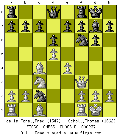 Last move : 0-1 2017 August 16 15:21:21 [Event "FICGS__CHESS__CLASS_D__000237"] [Site "FICGS"] [Date "2017.05.14"] [Round "1"] [White "de la Foret,Fred"] [Black "Schott,Thomas"] [Result "0-1"] [WhiteElo "1547"] [BlackElo "1662"] 1.e4 d6 2.d4 g6 3.Nf3 Bg7 4.Bc4 Nf6 5.Nc3 O-O 6.Qd3 Nc6 7.O-O Bg4 8.d5 Nb4 9.Qe2 Bxf3 10.Qxf3 Nxc2 0-1 This chess game has been lost on time (started : 2017.05.14 12:21:30) King's pawn Opening Kingside Castling by player Black (move 5) Kingside Castling by player White (move 7) Player Black won this chess game. Follow this game move after move (download)A player surprised is half beaten. (Proverb) Dass jemand wie Surab Asmaiparaschwili, der selbst Elopunkte gekauft hat , Vize-Präsident der Fide werden konnte, sagt schon einges über den Zustand dieser Organisation aus. (Joel Lautier) El Ajedrez por encima de todo... ¡es una pelea!. (Emanuel Lasker) On est toujours la mazette de quelqu'un d'autre. (Anonyme) There are two kinds of tragedy in this world, one is not getting what you want and the other is getting. (Lord of war)