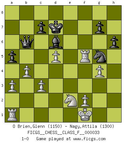 Last move : 1-0 2007 November 3 12:21:31 [Event "FICGS__CHESS__CLASS_F__000033"] [Site "FICGS"] [Date "2007.04.08"] [Round "1"] [White "O Brien,Glenn"] [Black "Nagy,Attila"] [Result "1-0"] [WhiteElo "1150"] [BlackElo "1300"] 1.e4 d5 2.exd5 Qxd5 3.Nc3 Qa5 4.d4 Nf6 5.Nf3 Bg4 6.h3 Bh5 7.g4 Bg6 8.Ne5 e6 9.Bg2 Be4 10.Bxe4 Nxe4 11.Qf3 Nd6 12.Nxf7 Nxf7 13.Qxb7 Bb4 14.O-O Kd7 15.Qf3 Rf8 16.Qxa8 Nc6 17.Qxf8 Bxf8 18.Rd1 Bd6 19.Be3 e5 20.d5 Ne7 21.a3 Ng6 22.Rd3 Nf4 23.Bxf4 exf4 24.Rf3 Qb6 25.b4 Ng5 26.Rd3 f3 27.Kf1 Nxh3 28.Rxf3 Ng5 29.Rf5 h6 30.Ne2 a5 31.c3 1-0 This chess game has been lost on time (started : 2007.04.08 0:3:28) Scandinavian defense, Lasker variation Kingside Castling by player White (move 14) Player White won this chess game. Follow this game move after move (download)In order to improve your game, you must study the endgame before everything else, for whereas the endings can be studied and mastered by themselves, the middle game and the opening must be studied in relation to the endgame. (Jose Raul Capablanca) Zeige mir drei Eröffnungsvarianten und ich beweise dir, dass zwei davon inkorrekt sind. (Emanuel Lasker) Uno por uno, yo los acribillé, mi superioridad muy pronto se volvio aparente. (Jose Capablanca) Il n'y a plus de joueurs du niveau de Jacob Murray dont la seule quête est le beau jeu, le plaisir de voir les pièces construire quelque chose. Sur 10 idées à la minute, 9 seront sans intérêt, la dernière s'avèrera géniale. (Christian Bauer) No man has ever achieved immortality in his own life time. (Unknown)