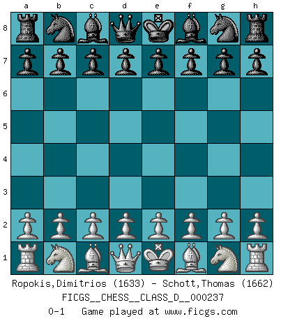Last move : 0-1 2017 June 23 22:4:30 [Event "FICGS__CHESS__CLASS_D__000237"] [Site "FICGS"] [Date "2017.05.14"] [Round "1"] [White "Ropokis,Dimitrios"] [Black "Schott,Thomas"] [Result "0-1"] [WhiteElo "1633"] [BlackElo "1662"] 0-1 This chess game has been lost on time (started : 2017.05.14 12:21:30) Player Black won this chess game. Follow this game move after move (download)Bobby Fischer is the greatest Chess player who has ever lived. (Ken Smith) Das Schachspiel hat wie die Liebe, die Musik, die Fähigkeit, den Menschen glücklich zu machen. Ich habe ein leises Gefühl des Bedauerns für jeden, der das Schachspiel nicht kennt, so wie ich jeden bedaure, der die Liebe nicht kennt. (Siegbert Tarrasch) Si un gobernante no entiende al Ajedrez, ¿como puede governar él un reinado?. (El Rey Khusros II) Les Cavaliers se révèlent fort utiles dans les positions fermées. D'habitude, les Fous sont un peu plus forts que les Cavaliers dans les positions ouvertes. Qu'on le veuille ou non, il restera toujours des exceptions ! For a mechanic, you seem to do an excessive amount of thinking. (C-3PO in Star Wars ep.2)