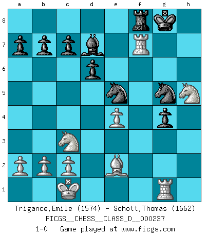 Last move : 1-0 2017 October 1 22:6:26 [Event "FICGS__CHESS__CLASS_D__000237"] [Site "FICGS"] [Date "2017.05.14"] [Round "1"] [White "Trigance,Emile"] [Black "Schott,Thomas"] [Result "1-0"] [WhiteElo "1574"] [BlackElo "1662"] 1.e4 d6 2.d4 g6 3.h4 Nf6 4.Nc3 Bg7 5.Be2 h5 6.Bg5 Nc6 7.Qd2 Nh7 8.Be3 e5 9.dxe5 Nxe5 10.O-O-O Nf6 11.Bg5 Bg4 12.f3 Be6 13.Nh3 O-O 14.Nf2 Qd7 15.Rhg1 Nh7 16.Bh6 f5 17.Bxg7 Qxg7 18.Nh3 fxe4 19.fxe4 Rf7 20.Nf4 Bd7 21.g4 hxg4 22.h5 gxh5 23.Nxh5 Qg5 24.Qxg5+ Nxg5 25.Rdf1 Raf8 26.Rxf7 1-0 King's pawn Opening Queenside Castling by player White (move 10) Kingside Castling by player Black (move 13) Player White won this chess game. Follow this game move after move (download)Chess is as much a mystery as women. (Purdy) Wie ich sie so einen nach dem anderen nieder mähte wurde meine Überlegenheit offensichtlich. (José Raúl Capablanca) Cuando le juegas a Fischer, no es una cuestion de si vas a ganar o perder. Es una cuestion de si vas a sobrevivir. (Boris Spassky) Je crois qu'il existe des manières très spécifiques de jouer efficacement contre une machine. Evidemment, nous n'avons aucune chance en technique pure, parce que l'ordinateur calcule de manière parfaite. Mais lorsque nous faisons appel à notre cerveau, en utilisant l'intuition et la compréhension, alors nous restons beaucoup plus forts. (Anatoli Karpov) CHESS, n. f. [echecs, Fr.] A nice and abstruse game, in which two sets of puppets are moved in opposition to each other. (Dr Samuel Johnson, A Dictionary Of The English Language, 1755)