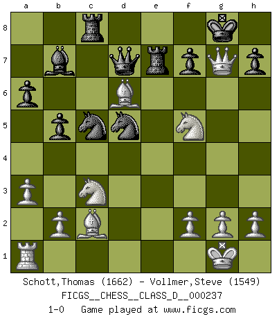 Last move : 1-0 2017 June 20 1:38:19 [Event "FICGS__CHESS__CLASS_D__000237"] [Site "FICGS"] [Date "2017.05.14"] [Round "1"] [White "Schott,Thomas"] [Black "Vollmer,Steve"] [Result "1-0"] [WhiteElo "1662"] [BlackElo "1549"] 1.d4 Nf6 2.c4 e6 3.Nf3 b6 4.a3 Bb7 5.Nc3 Be7 6.d5 exd5 7.cxd5 O-O 8.e4 d6 9.Bd3 c6 10.O-O cxd5 11.exd5 Nbd7 12.Re1 Re8 13.Bf4 a6 14.Nd4 Rc8 15.Nf5 Nc5 16.Bc2 Qd7 17.Qd4 b5 18.Rxe7 Rxe7 19.Bxd6 Nxd5 20.Qxg7+ 1-0 Queen's Indian : Petrosian system Kingside Castling by player Black (move 7) Kingside Castling by player White (move 10) Player White won this chess game. Follow this game move after move (download)There are two classes of men; those who are content to yield to circumstances and who play whist; those who aim to control circumstances, and who play Chess. (Mortimer Collins) Oft bringt ein stiller Zug das Erdbeben. (Richard Reti) Todo se encuentra en un estado de flujo y esto incluye al mundo del Ajedrez. (Mikhail Botvinnik) Soyez une menace à chaque fois que vous vous asseyez pour jouer. (Ken Smith) Chess is as much a mystery as women. (Purdy)