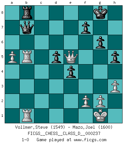 Last move : 1-0 2017 May 28 3:15:27 [Event "FICGS__CHESS__CLASS_D__000237"] [Site "FICGS"] [Date "2017.05.14"] [Round "1"] [White "Vollmer,Steve"] [Black "Mazo,Joel"] [Result "1-0"] [WhiteElo "1549"] [BlackElo "1600"] 1.d4 Nf6 2.c4 c5 3.e3 cxd4 4.exd4 d6 5.Nf3 g6 6.Nc3 Bg7 7.Bd3 Nc6 8.O-O O-O 9.h3 a6 10.Be3 e6 11.Rc1 Bd7 12.a3 Rc8 13.b4 Be8 14.Qb3 d5 15.c5 b6 16.Bxa6 Ra8 17.Be2 Qb8 18.cxb6 Qxb6 19.Rb1 h5 20.Rfc1 Ne7 21.a4 Nf5 22.a5 Qb7 23.Bf4 Bd7 24.Be5 Ne4 25.Bxg7 Kxg7 26.Qd1 Rfc8 27.Nxe4 dxe4 28.Ne5 Be8 29.Nc4 Rd8 30.Ne3 Nxd4 31.Qe1 Nxe2+ 32.Qxe2 Bb5 33.Qb2+ Kg8 34.Qe5 Bd3 35.Rb2 Rac8 36.Ra1 Rb8 37.b5 Bxb5 38.Rab1 Rd5 39.Nxd5 exd5 40.Rxb5 1-0 Benoni defense Kingside Castling by player White (move 8) Kingside Castling by player Black (move 8) Player White won this chess game. Follow this game move after move (download)Dazzling combinations are for the many, shifting wood is for the few. (Georg Kieninger) Das Schach hält seine Meister in eigenen Banden, Fesseln; auf vielerlei Weise formt es ihren Geist, so dass die innere Freiheit selbst des Stärksten beeinflusst wird. (Albert Einstein) Un jugador que trata de regresar una movida en el Ajedrez es un futuro carterista. (Richard Fenton) C'est une question de caractère, Beaucoup de gens perdent leur motivation très vite. D'autres, ils sont rares, peuvent la conserver très longtemps. J'aime les échecs, encore aujourd'hui je suis heureux d'analyser des parties. J'aime toujours gagner, je déteste encore perdre. Bien jouer est important pour mon intégrité intellectuelle et morale. Et puis les échecs vivent en ce moment une période historique grâce à Internet. Ils se développent dans les systèmes éducatifs à travers le monde. Ils sortent de leur ghetto, et c'est mon rôle de mener à bien cette révolution. (Gary Kasparov) Lamb in skin of tiger, still fears the wolf. (Chinese proverb)