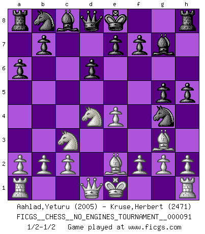 Last move : 1/2-1/2 2017 June 8 19:6:24 [Event "FICGS__CHESS__NO_ENGINES_TOURNAMENT__000091"] [Site "FICGS"] [Date "2017.05.15"] [Round "1"] [White "Aahlad,Yeturu"] [Black "Kruse,Herbert"] [Result "1/2-1/2"] [WhiteElo "2005"] [BlackElo "2471"] 1.e4 c5 2.Nf3 d6 3.d4 cxd4 4.Nxd4 Nf6 5.Nc3 a6 6.Be3 Ng4 7.Bg5 h6 8.Bh4 g5 9.Bg3 Bg7 10.Be2 h5 1/2-1/2 Sicilian : Najdorf, Byrne (English) attack This chess game ended in a draw. Follow this game move after move (download)Chess is a fairy tale of 1001 blunders. (Savielly Tartakower) Im Schach nämlich geht es darum, daß Ich des Gegners klein zu kriegen, sein Ego zu zerbrechen und zu zermahlen, seine Selbstachtung zu zertreten und zu verscharren und seine ganze mißachtenswerte sogenannte Persönlichkeit ein für alle Mal tot zu hacken und zu zerstampfen und dadurch die menschliche Gesellschaft von einer stinkenden Pestbeule zu befreien. Es ist ein königliches Spiel. (Robert James Fischer) Hoy en día, si tu no eres un Gran Maestro a los 14 años, es mejor que lo olvides. (Anand Viswanathan) Votre seul travail dans les ouvertures est d'obtenir un milieu de partie jouable. (Lajos Portish) If I had no sense of humor, I would long ago have committed suicide. (Mahatma Gandhi)