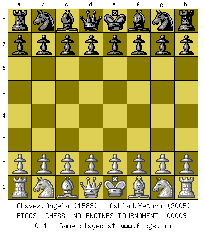 Last move : 0-1 2017 June 24 10:5:58 [Event "FICGS__CHESS__NO_ENGINES_TOURNAMENT__000091"] [Site "FICGS"] [Date "2017.05.15"] [Round "1"] [White "Chavez,Angela"] [Black "Aahlad,Yeturu"] [Result "0-1"] [WhiteElo "1583"] [BlackElo "2005"] 0-1 This chess game has been lost on time (started : 2017.05.15 3:1:57) Player Black won this chess game. Follow this game move after move (download)There is no remorse like the remorse of Chess. (H. G. Wells) Du kannst im Schach nur gut werden, wenn du das Spiel liebst. (Robert James Fischer) Hasta este punto, las blancas han seguido un análisis bien conocido. Pero ahora el hace un error fatal: empieza a usar su propia cabeza. (Siegbert Tarrasch) Les échecs sont un jeu par leur forme, un art par leur essence et une science par sa difficulté d'acquisition. Ils peuvent vous procurer autant de plaisir qu'un bon livre ou une belle musique, mais vous n'aurez une réelle joie que si vous arrivez à bien jouer. (Tigran Petrosian) We're missing something. (Gregory House, House M.D.)