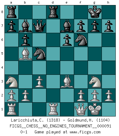 Last move : 0-1 2017 August 27 17:34:50 [Event "FICGS__CHESS__NO_ENGINES_TOURNAMENT__000091"] [Site "FICGS"] [Date "2017.05.15"] [Round "1"] [White "Laricchiuta,Claudio"] [Black "Goldmund,Heike"] [Result "0-1"] [WhiteElo "1318"] [BlackElo "1104"] 1.e4 d5 2.Nf3 dxe4 3.Ng5 Nf6 4.Bc4 e6 5.Qe2 Bc5 6.c3 b6 7.d4 Be7 8.Nxe4 Nbd7 9.O-O Bb7 10.Ng3 c5 11.Be3 Qc7 12.Rd1 O-O 13.Na3 Qc6 14.Qf1 Rfd8 15.Bb5 Qc7 16.dxc5 Nxc5 0-1 This chess game has been lost on time (started : 2017.05.15 3:1:57) Scandinavian (centre counter) defense Kingside Castling by player White (move 9) Kingside Castling by player Black (move 12) Player Black won this chess game. Follow this game move after move (download)If your opponent offers you a draw, try to work out why he thinks he's worse off. (Nigel Short) Als er Schachweltmeister wurde ließ er praktisch alle stärksten Sovietspieler für sich arbeiten. Wenn ein auch nur mittelmässiger Meister ein Spezialist für eine bestimmte Eröffnung war, wurde er von Karpov gerufen. Das wurde alles geheim gehalten. (Mikhail Moiseyevich Botvinik) Cuando tu casa esta en llamas, no puedes ser molestado por tus vecinos. O, como decinos en Ajedrez, si tu Rey esta bajo ataque, no te preocupa perder un Peón del lado de la Reina. (Gary Kasparov) A chaque perte on perd un peu de soi. (Joël Lautier) Don't anthropomorphize computers - they hate it. (Anonymous)