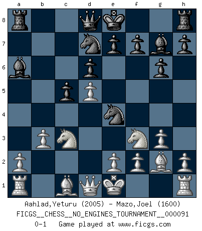 Last move : 0-1 2017 June 29 2:29:38 [Event "FICGS__CHESS__NO_ENGINES_TOURNAMENT__000091"] [Site "FICGS"] [Date "2017.05.15"] [Round "1"] [White "Aahlad,Yeturu"] [Black "Mazo,Joel"] [Result "0-1"] [WhiteElo "2005"] [BlackElo "1600"] 1.c4 Nf6 2.d4 c5 3.d5 b5 4.cxb5 a6 5.bxa6 Bxa6 6.b3 g6 7.Nc3 Bg7 8.g3 d6 9.Bg2 Nbd7 10.Nf3 Ne4 0-1 English, 1...Nf6 (Anglo-Indian defense) Player Black won this chess game. Follow this game move after move (download)Look at Garry Kasparov. After he loses, invariably he wins the next game. He just kills the next guy. That's something that we have to learn to be able to do. (Maurice Ashley) Über Karpov: Er war und ist ein Vertreter der russischen Reaktionäre. Das steckt tief in seiner Seele, wehalb ich nicht nett mit ihm umgehen kann. (Viktor Kortschnoi) ¿Se han dado cuenta de que Fischer casi nunca ha tenido piezas malas? El las intercambia y las piezas malas se quedan con sus oponenets. (Yuri Balashov) Horreur, mais aussi harmonie suprême : qu'y avait-il en effet au monde en dehors des échecs ? Le brouillard, l'inconnu, le non-être... (Vladimir Nabokov) When the going gets tactical, the computers get going. (Hyatt)
