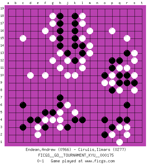 Last move : 0-1 2017 September 20 20:48:44 [Event "FICGS__GO__TOURNAMENT_KYU__000175"] [Site "FICGS"] [Date "2017.05.23"] [Round "1"] [Black "Endean,Andrew"] [White "Cirulis,Ilmars"] [Result "0-1"] [Rating 1 "0966"] [Rating 2 "0277"] 1.q4 c15 2.d4 p16 3.r6 r15 4.q10 f16 5.k4 d10 6.c6 j10 7.r13 f10 8.k16 m16 9.h17 g17 10.h16 l17 11.k17 l18 12.k18 m14 13.l14 m13 14.l13 l12 15.k12 l15 16.k15 l11 17.k11 k10 18.j11 h11 19.h12 k13 20.k14 j12 21.j13 h13 22.k12 g12 23.h14 g15 24.h15 g18 25.h18 e2 26.c3 h3 27.j3 h4 28.f3 e3 29.e4 f4 30.f5 g4 31.g5 h5 32.h6 j6 33.h7 k5 34.l4 q3 35.p3 p2 36.q2 r3 37.r4 r2 38.o2 q1 39.o4 r11 40.r10 q11 41.p11 s10 42.s9 s12 43.p12 s13 44.q12 p10 45.o10 p9 46.q9 q8 47.r9 s8 48.p8 o9 0-1 This go game has been lost on time (started : 2017.05.23 7:4:19) Here are the names of the openings (joseki) played in the four corners : Player White won this Go (weiqi, baduk) game. Follow this game move after move (download)Take the cutting stone on the second line. (Anonymous) All men can see these tactics whereby I conquer, but what none can see is the strategy out of which victory is evolved. (Sun Tzu)