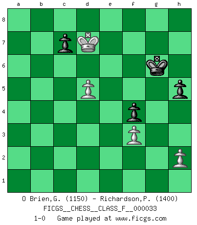 Last move : 1-0 2007 May 28 14:51:25 [Event "FICGS__CHESS__CLASS_F__000033"] [Site "FICGS"] [Date "2007.04.08"] [Round "1"] [White "O Brien,Glenn"] [Black "Richardson,Patrick"] [Result "1-0"] [WhiteElo "1150"] [BlackElo "1400"] 1.e4 e5 2.Nf3 Nc6 3.Bb5 a6 4.Ba4 b5 5.Bb3 Nf6 6.O-O Bd6 7.Re1 O-O 8.c3 Re8 9.d3 Bb7 10.Ng5 Rf8 11.d4 Be7 12.a4 d6 13.axb5 axb5 14.Rxa8 Qxa8 15.Na3 b4 16.Nc4 bxc3 17.bxc3 h6 18.Nh3 Na5 19.f3 Nxb3 20.Qxb3 exd4 21.cxd4 d5 22.exd5 Nxd5 23.Nf4 Bb4 24.Re4 Qa1 25.Nd3 Ra8 26.Qb2 Qxb2 27.Bxb2 Bc3 28.Nc5 Bxb2 29.Nxb2 Ra1+ 30.Kf2 Ra2 31.Re8+ Kh7 32.Re2 Nf4 33.Rd2 Bc6 34.Nc4 Rxd2+ 35.Nxd2 Bb5 36.Nde4 Nd3+ 37.Nxd3 Bxd3 38.Nd2 g5 39.Ke3 Bf5 40.d5 Kg6 41.Nb3 h5 42.Nc5 Bc8 43.Kd4 f5 44.Ke5 f4 45.Ne6 Bxe6 46.Kxe6 g4 47.Kd7 gxf3 48.gxf3 1-0 Ruy Lopez : Caro variation Kingside Castling by player White (move 6) Kingside Castling by player Black (move 7) 10 pieces endgame at move 46 : White KPPPP , Black KPPPP WHITE : King + 4 Pawns BLACK : King + 4 Pawns 9 pieces endgame at move 47 : White KPPP , Black KPPPP WHITE : King + 3 Pawns BLACK : King + 4 Pawns 8 pieces endgame at move 48 : White KPPP , Black KPPP WHITE : King + 3 Pawns BLACK : King + 3 Pawns Player White won this chess game. Follow this game move after move (download)The hardest game to win is a won game. (Emanuel Lasker) Ich bin es gewohnt, das die Jugend mir überhaupt keinen Respekt entgegenbringt. (Alexander Morozewich) Si tu oponente te ofrece un empate, trata de averiguar porque piensa él que esta en una posición peor. (Nigel Short) Même si vous avez un bon coup à faire, regardez toujours s'il n'y en a pas un qui lui soit préférable. (Pedro Damiano) If only people were all showed a certain minimum level of niceness; if only people didn't retract verbal draw offers (without draw box ticked) on ficgs; if only people didn't kill; if only people didn't run concentration / extermination camps, if only people didn't drop nuclear bombs on Hiroshima and Nagasaki, and so on - it would be a much more beautiful world. But sadly, things are not so... (Normajean Yates)