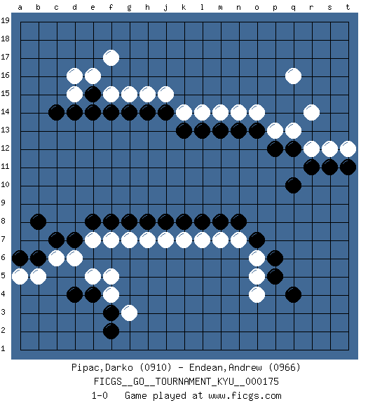 Last move : 1-0 2017 August 26 5:27:47 [Event "FICGS__GO__TOURNAMENT_KYU__000175"] [Site "FICGS"] [Date "2017.05.23"] [Round "1"] [Black "Pipac,Darko"] [White "Endean,Andrew"] [Result "1-0"] [Rating 1 "0910"] [Rating 2 "0966"] 1.d4 q16 2.q4 d16 3.c14 f17 4.e15 d15 5.d14 e16 6.f14 f15 7.e14 g15 8.g14 h15 9.h14 j15 10.j14 k14 11.k13 l14 12.l13 m14 13.m13 n14 14.n13 o14 15.o13 p13 16.p12 q13 17.q12 r12 18.r11 s12 19.s11 t12 20.t11 r14 21.q10 c6 22.c7 d6 23.d7 e7 24.e8 f7 25.f8 g7 26.g8 h7 27.h8 j7 28.j8 k7 29.k8 l7 30.l8 m7 31.m8 n7 32.n8 e5 33.o7 o6 34.p6 o5 35.p5 o4 36.b6 b5 37.a6 a5 38.b8 f5 39.e4 f4 40.f3 g3 41.f2 1-0 This go game has been lost on time (started : 2017.05.23 7:4:19) Here are the names of the openings (joseki) played in the four corners : Corner d16 : d16 c14 Hoshi (Hwajeom, Seongjeom, Xingwei`) 4-4 Point. The star or hoshi (4-4) point, emphasizing influence at the potential expense of territory. Ikken Kakari (Hankan Keolch'im, Yi Gua`jiao~, 1-Space Low Approach). Black 2 is the standard approach move to the 4-4. Corner d4 : d4 c6 Hoshi (Hwajeom, Seongjeom, Xingwei`) 4-4 Point. The star or hoshi (4-4) point, emphasizing influence at the potential expense of territory. Ikken Kakari (Hankan Keolch'im, Yi Gua`jiao~, 1-Space Low Approach). White 2 is the standard approach move to the 4-4. Corner q4 : q4 l7 Hoshi (Hwajeom, Seongjeom, Xingwei`) 4-4 Point. The star or hoshi (4-4) point, emphasizing influence at the potential expense of territory. Player Black won this Go (weiqi, baduk) game. Follow this game move after move (download)Don't try to enclose an open skirt. (Anonymous) I don't believe in psychology. I believe in good moves. (Bobby Fischer)