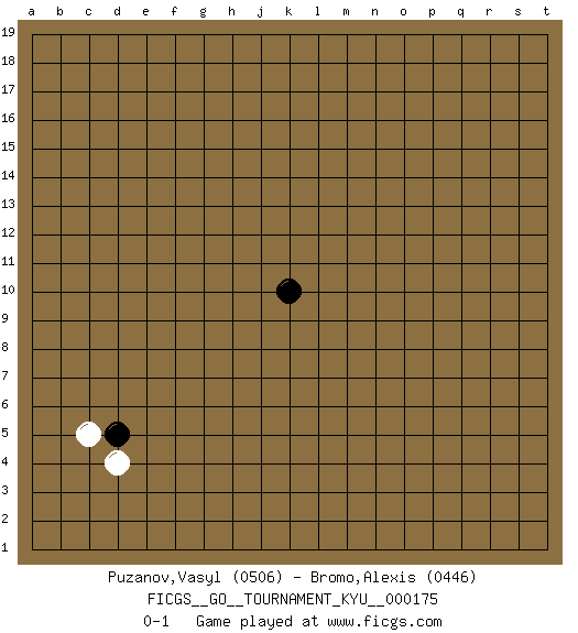 Last move : 0-1 2017 June 26 10:15:21 [Event "FICGS__GO__TOURNAMENT_KYU__000175"] [Site "FICGS"] [Date "2017.05.23"] [Round "1"] [Black "Puzanov,Vasyl"] [White "Bromo,Alexis"] [Result "0-1"] [Rating 1 "0506"] [Rating 2 "0446"] 1.k10 d4 2.d5 c5 0-1 This go game has been lost on time (started : 2017.05.23 7:4:19) Here are the names of the openings (joseki) played in the four corners : Corner d4 : d4 d5 Hoshi (Hwajeom, Seongjeom, Xingwei`) 4-4 Point. The star or hoshi (4-4) point, emphasizing influence at the potential expense of territory. Player White won this Go (weiqi, baduk) game. Follow this game move after move (download)If you lose by one point, take a rest. (Anonymous) Wisdom is the reward you get for a lifetime of listening when you'd have preferred to talk. (Doug Larson)