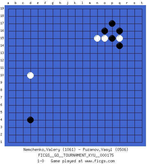 Last move : 1-0 2017 June 29 10:24:52 [Event "FICGS__GO__TOURNAMENT_KYU__000175"] [Site "FICGS"] [Date "2017.05.23"] [Round "1"] [Black "Nemchenko,Valery"] [White "Puzanov,Vasyl"] [Result "1-0"] [Rating 1 "1061"] [Rating 2 "0506"] 1.d4 d10 2.q16 q15 3.p15 p16 4.o16 o15 5.p17 n15 6.q14 1-0 This go game has been lost on time (started : 2017.05.23 7:4:19) Here are the names of the openings (joseki) played in the four corners : Corner q16 : q16 q15 Hoshi (Hwajeom, Seongjeom, Xingwei`) 4-4 Point. The star or hoshi (4-4) point, emphasizing influence at the potential expense of territory. Player Black won this Go (weiqi, baduk) game. Follow this game move after move (download)The second line is the line of defeat, the third line is the line of territory, and the fourth line is the line of influence. (Anonymous) If you don't practice you don't deserve to win. (Andre Agassi)