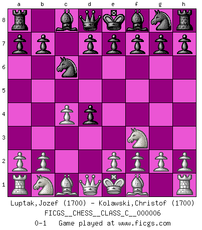 Last move : 0-1 2006 July 17 14:11:54 [Event "FICGS__CHESS__CLASS_C__000006"] [Site "FICGS"] [Date "2006.05.31"] [Round "1"] [White "Luptak,Jozef"] [Black "Kolawski,Christof"] [Result "0-1"] [WhiteElo "1700"] [BlackElo "1700"] 1.c4 c5 2.Nf3 Nc6 3.d4 cxd4 0-1 This chess game has been lost on time (started : 2006.05.31 8:2:36) English : Symmetrical variation Player Black won this chess game. Follow this game move after move (download)The older I grow, the more I value Pawns. (Keres) Ich würde die 30 stärksten Spieler der USA im Simultanspiel besiegen. (José Raúl Capablanca) Un mal plan es mejor que no tener ningún plan. (Frank Marshall) A ce moment-là, je menaçais de comprendre la position ! (Clément L'Heureux) Watch your thoughts; they become words. Watch your words; they become actions. Watch your actions; they become habits. Watch your habits; they become character. Watch your character; it becomes your destiny. (Frank Outlaw)