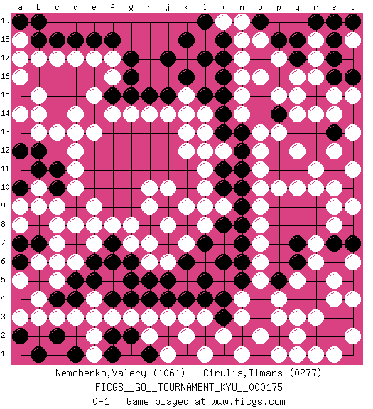 Last move : 0-1 2017 October 28 17:6:48 [Event "FICGS__GO__TOURNAMENT_KYU__000175"] [Site "FICGS"] [Date "2017.05.23"] [Round "1"] [Black "Nemchenko,Valery"] [White "Cirulis,Ilmars"] [Result "0-1"] [Rating 1 "1061"] [Rating 2 "0277"] 1.d4 q16 2.d16 p4 3.n5 o6 4.n6 o7 5.n7 o8 6.n8 o9 7.n9 o10 8.n10 o11 9.n11 o12 10.n12 o13 11.n13 n14 12.m14 n15 13.m15 n16 14.m16 n17 15.m17 d10 16.e6 d14 17.e14 d13 18.d15 e13 19.f15 f14 20.e16 g14 21.g15 h14 22.h15 j14 23.j15 r3 24.o4 p3 25.o3 o5 26.p2 q2 27.q1 o2 28.o1 p1 29.n2 n1 30.m3 m2 31.m4 n3 32.l2 n4 33.k1 l3 34.l4 k3 35.k4 j3 36.j4 h3 37.h4 g3 38.g4 f3 39.f4 d3 40.e3 e2 41.e5 c3 42.c4 c8 43.d7 b15 44.c15 b14 45.b16 h10 46.c7 d8 47.b8 b9 48.a7 g8 49.e8 e9 50.f7 f8 51.g6 b4 52.b5 b3 53.a4 a3 54.a6 a9 55.c14 c13 56.a15 b13 57.h8 h9 58.j9 j10 59.k8 h7 60.j7 j8 61.k6 k9 62.l7 n18 63.m18 m19 64.l19 n19 65.k18 l13 66.k14 k13 67.l15 l8 68.m8 k7 69.m6 j6 70.l5 a14 71.a17 a16 72.b18 a5 73.m1 l1 74.a4 k2 75.j5 l14 76.k16 l11 77.l9 l10 78.k8 c17 79.c18 l8 80.m10 h6 81.h5 b17 82.c16 a18 83.b19 d17 84.d18 e17 85.e18 f17 86.g17 f16 87.g16 e15 88.f18 m9 89.m11 l9 90.l12 k12 91.m13 a8 92.b7 e7 93.a19 g7 94.e8 l18 95.l17 e7 96.f6 e8 97.q13 r14 98.r13 s14 99.p12 r10 100.q11 r11 101.r12 q10 102.p11 p13 103.p14 p10 104.s11 q14 105.s13 s10 106.t10 t9 107.t12 s9 108.t14 s15 109.t16 a5 110.s17 r18 111.s18 t15 112.s19 r17 113.s16 r16 114.r19 t18 115.t19 e4 116.q18 c5 117.b6 d6 118.d5 c6 119.e3 a17 120.p18 p17 121.o19 o18 122.o17 p15 123.q17 o16 124.s6 r7 125.s7 r6 126.t8 s8 127.t7 s5 128.t5 t4 129.r5 s4 130.q6 pass 131.r4 pass 132.s3 t6 133.q4 pass 134.p5 pass 135.r2 q3 136.t3 r1 137.s2 s1 138.t1 q1 139.a2 e4 140.b1 e3 141.c2 pass 142.d1 pass 143.f2 e1 144.f1 k15 145.j17 k14 146.g2 m12 147.a6 f5 148.g5 l12 149.b7 b6 150.a7 c7 151.a10 q12 152.b11 b10 153.c10 d11 154.c11 d12 155.b12 a11 156.a12 c9 157.a10 q5 158.h1 h2 159.j2 j1 160.s7 t2 161.r15 q15 162.t7 t13 163.q7 s12 164.s13 t11 165.pass pass 0-1 Here are the names of the openings (joseki) played in the four corners : Corner q4 : p4 n5 Takamoku (Gomok, Gaomu`) 5-4 Point. The takamoku (high) point (5-4). With its emphasis on influence, the 5-4 point complements the 4-4 (hoshi) point in creating an influence-oriented fuseki. Corner d16 : d16 d14 Hoshi (Hwajeom, Seongjeom, Xingwei`) 4-4 Point. The star or hoshi (4-4) point, emphasizing influence at the potential expense of territory. Ikken Takagakari (Hankan Nop'dakeolch'im, Yi Gaojia, 1-Space High Approach). Black typically responds at 6-4 or 3-10. Black 4-10 is played when Black finds play on the right side advantageous. Black 4-8 or 3-8 may be played when Black has support at top. Player White won this Go (weiqi, baduk) game. Follow this game move after move (download)Don't reduce your own liberties. (Bill Taylor) The Movers & Shakers of this world are those who play chess in the mornings and go to the disco in the evenings. (Dinesh De Silva)