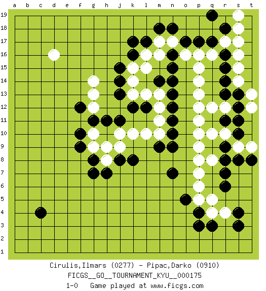 Last move : 1-0 2017 August 6 9:1:54 [Event "FICGS__GO__TOURNAMENT_KYU__000175"] [Site "FICGS"] [Date "2017.05.23"] [Round "1"] [Black "Cirulis,Ilmars"] [White "Pipac,Darko"] [Result "1-0"] [Rating 1 "0277"] [Rating 2 "0910"] 1.p3 d16 2.c4 q16 3.r6 g13 4.k16 l16 5.l17 l15 6.k17 k15 7.o17 n17 8.n18 m17 9.m18 o16 10.p17 p16 11.q17 r17 12.r18 s18 13.q19 s19 14.r16 s17 15.r15 s16 16.r14 s15 17.r13 s14 18.n16 m16 19.n15 p14 20.n14 p13 21.j15 k14 22.j14 k13 23.j13 p15 24.k12 l13 25.l12 m13 26.n13 m12 27.n12 m11 28.n11 p11 29.n10 m10 30.n9 p12 31.r11 p10 32.r9 r12 33.s12 q12 34.s13 p9 35.m9 l10 36.j11 k10 37.k8 j9 38.j8 j10 39.g8 t13 40.g11 g10 41.f10 g12 42.h11 g9 43.f9 h8 44.h7 h9 45.g7 g14 46.f12 p8 47.n7 p7 48.r7 p6 49.o5 p5 50.p4 q5 51.s4 q4 52.q3 r4 53.s3 q8 54.r8 r10 55.s10 q10 56.m14 s9 57.s8 t9 58.t8 t12 59.s11 1-0 Here are the names of the openings (joseki) played in the four corners : Corner d4 : c4 j9 Komoku (Somok, Xiao~mu`) 3-4 Point. The komoku (3-4) point is the traditional corner enclosure move.. Player Black won this Go (weiqi, baduk) game. Follow this game move after move (download)To emphasize the lack of determination in his moves, one speaks of chance. (Pierre Audouard) To send light into the darkness of men's hearts - such is the duty of the artist. (Schumann)