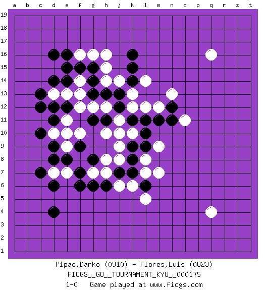 Last move : 1-0 2017 July 15 12:32:0 [Event "FICGS__GO__TOURNAMENT_KYU__000175"] [Site "FICGS"] [Date "2017.05.23"] [Round "1"] [Black "Pipac,Darko"] [White "Flores,Luis"] [Result "1-0"] [Rating 1 "0910"] [Rating 2 "0823"] 1.d4 q4 2.d16 q16 3.c10 d10 4.d8 e9 5.d11 e11 6.e12 f10 7.d9 e10 8.c12 d13 9.d14 e13 10.d12 f12 11.e14 f14 12.c13 f13 13.f15 f16 14.e16 g16 15.g15 h15 16.g14 h14 17.g13 g12 18.h13 h12 19.j13 j14 20.j12 j11 21.k11 k13 22.k14 k12 23.e15 l12 24.l11 l14 25.k15 h16 26.k16 k10 27.l10 j10 28.l9 l8 29.k9 j9 30.k8 j8 31.k7 l7 32.l6 m7 33.e8 f8 34.f7 g7 35.g6 e7 36.f6 h7 37.h6 j6 38.j7 k6 39.d6 l5 40.g8 h8 41.f9 d7 42.c7 m9 43.m11 m12 44.n11 o11 45.n12 n13 46.h11 h10 47.g11 1-0 Here are the names of the openings (joseki) played in the four corners : Corner q4 : q4 l9 Hoshi (Hwajeom, Seongjeom, Xingwei`) 4-4 Point. The star or hoshi (4-4) point, emphasizing influence at the potential expense of territory. Player Black won this Go (weiqi, baduk) game. Follow this game move after move (download)Do not make moves that strengthen your opponent ! (Anonymous) Logic : The art of thinking and reasoning in strict accordance with the limitations and incapacities of the human misunderstanding. (Ambrose Bierce)