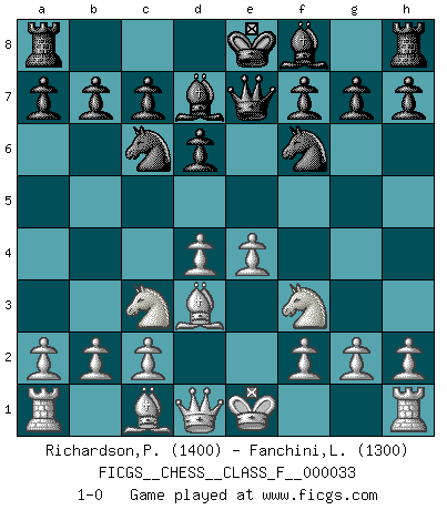 Last move : 1-0 2007 May 21 16:24:9 [Event "FICGS__CHESS__CLASS_F__000033"] [Site "FICGS"] [Date "2007.04.08"] [Round "1"] [White "Richardson,Patrick"] [Black "Fanchini,Laurent"] [Result "1-0"] [WhiteElo "1400"] [BlackElo "1300"] 1.e4 e5 2.Nf3 Nf6 3.Nxe5 Qe7 4.d4 d6 5.Nf3 Bd7 6.Nc3 Nc6 7.Bd3 1-0 This chess game has been lost on time (started : 2007.04.08 0:3:28) Petrov's defense Player White won this chess game. Follow this game move after move (download)First-class players lose to second class players because second-class players sometimes play a first-class game. (Tarrasch) Ich bin Weltmeister und muß mit niemandem irgend etwas diskutieren. (Viswanathan Anand) Por esta medida (el intervalo entre Fischer y sus contemporaneos), yo le considero el mas grande campeón mundial. (Garry Kasparov) Nous vivons dans un monde échiquéen : chaque jour qui passe est un défi à relever. (Philosophe Sasha) You know what they say : You lie down with the Devil, you wake up in Hell. (Horatio Caine, C.S.I. Miami)