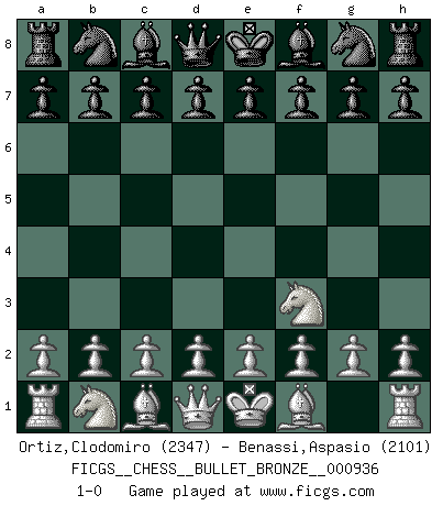 Last move : 1-0 2017 May 30 12:26:2 [Event "FICGS__CHESS__BULLET_BRONZE__000936"] [Site "FICGS"] [Date "2017.05.30"] [Round "1"] [White "Ortiz,Clodomiro"] [Black "Benassi,Aspasio"] [Result "1-0"] [WhiteElo "2347"] [BlackElo "2101"] 1.Nf3 1-0 This chess game has been lost on time (started : 2017.05.30 10:28:27) Reti Opening Player White won this chess game. Follow this game move after move (download)In blitz, the Knight is stronger than the Bishop. (Vlastimil Hort) Im Leben werden Partien nie so unstrittig gewonnen wie im Spiel (Emanuel Lasker) Por esta medida (el intervalo entre Fischer y sus contemporaneos), yo le considero el mas grande campeón mundial. (Garry Kasparov) Le système Elo représente seulement une moyenne. Il est simplement un indicateur de votre stabilité. (Anatoli Karpov) Opportunities multiply as they are seized. (Sun Tzu)