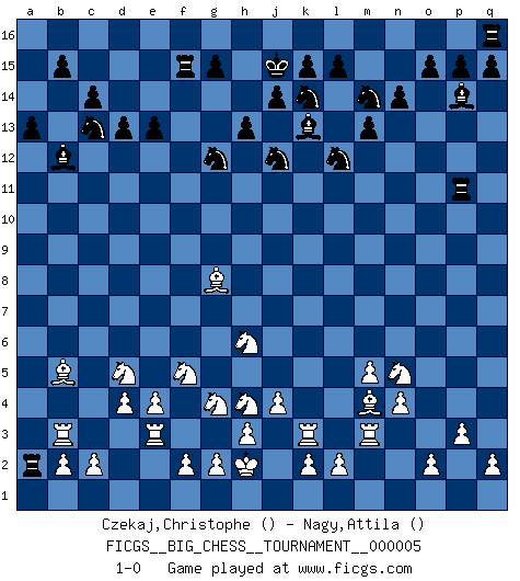 Last move : 1-0 2007 September 30 16:40:57 [Event "FICGS__BIG_CHESS__TOURNAMENT__000005"] [Site "FICGS"] [Date "2007.04.08"] [Round "1"] [White "Czekaj,Christophe"] [Black "Nagy,Attila"] [Result "1-0"] [WhiteElo ""] [BlackElo ""] 1.j2-h4 p16-o14 2.h1-o7 n15-n14 3.o7-f15 g16-f14 4.m2-m4 h15-g13 5.f15-o7 c15-c14 6.d2-d4 j15-k13 7.n2-n4 h16-m12 8.g1-f3 m15-m13 9.l1-p5 k16-h15 10.c1-l9 m12-j12 11.o7-f7 o16-j11 12.l9-j11 k13-j11 13.f7-j7 j11-l12 14.j7-j12 g13-j12 15.o1-f9 l16-m15 16.e2-e4 d15-d13 17.f1-b5 h15-k14 18.b1-c3 c16-k9 19.m1-m3 e15-e13 20.m3-k3 k9-l10 21.p1-o3 b16-d15 22.q1-m1 m15-k13 23.m1-m3 f16-b12 24.h2-j4 h14-h13 25.k1-h2 f14-g12 26.h2-g4 e16-f16 27.j4-h6 f16-f10 28.h4-f5 a16-f16 29.f9-g8 o14-n12 30.e1-e3 l10-g6 31.j3-j4 n12-m14 32.f3-h4 g6-p14 33.j1-h2 f16-f11 34.a1-d1 j16-j15 35.d1-d3 m16-f16 36.c3-d5 d15-c13 37.d3-b3 a15-a13 38.m4-m5 f16-f12 39.p5-o4 f12-f15 40.o4-n5 f11-p11 41.n5-m4 f10-a10 42.p2-p3 a10-a2 43.o3-n5 1-0 This big chess game has been lost on time (started : 2007.04.08 0:40:31) Follow this game move after move (download)Chess is a forcing house where the fruits of character can ripen more fully than in life. (Edward Morgan Foster) Schach ist ein Kampf gegen den Fehler. (Johannes Herrman Zukertort) La partida mas dura de ganar es una partida ganada. (Emanuel Lasker) Avant la finale, les dieux ont créé le milieu de partie. (Tarrasch) This is where the fun begins. (Anakin Skywalker in Star Wars ep.3)