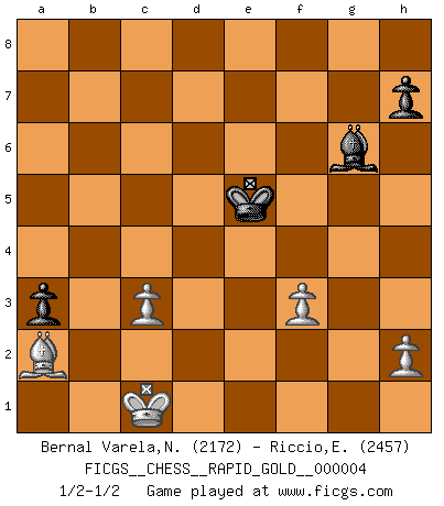 Last move : 1/2-1/2 2017 August 18 11:30:21 [Event "FICGS__CHESS__RAPID_GOLD__000004"] [Site "FICGS"] [Date "2017.05.31"] [Round "1"] [White "Bernal Varela,Nelson"] [Black "Riccio,Eros"] [Result "1/2-1/2"] [WhiteElo "2172"] [BlackElo "2457"] 1.e4 e5 2.Nf3 Nc6 3.Bb5 a6 4.Ba4 Nf6 5.O-O Be7 6.Re1 b5 7.Bb3 O-O 8.c3 d5 9.exd5 Nxd5 10.Nxe5 Nxe5 11.Rxe5 c6 12.d4 Bd6 13.Re1 Qh4 14.g3 Qh3 15.Qd3 Bg4 16.Be3 Rae8 17.Nd2 Re6 18.a4 bxa4 19.Bxa4 Bf4 20.Qf1 Nxe3 21.Qxh3 Bxh3 22.Nf3 Nc4 23.Rxe6 fxe6 24.gxf4 Rxf4 25.Ne1 Nxb2 26.Bxc6 Rf5 27.f3 a5 28.Rb1 Nc4 29.Kf2 Rf7 30.Nd3 Bf5 31.Ke2 g5 32.Rg1 a4 33.Rxg5+ Rg7 34.Rxg7+ Kxg7 35.Nb4 Nb2 36.Kd2 Kf6 37.Nc2 Nc4+ 38.Kc1 a3 39.Bb5 Bxc2 40.Bxc4 Bg6 41.Ba2 e5 42.dxe5+ Kxe5 1/2-1/2 Ruy Lopez : Closed, 7...O-O Kingside Castling by player White (move 5) Kingside Castling by player Black (move 7) 10 pieces endgame at move 42 : White KBPPPP , Black KBPP WHITE : King + 1 Bishop 4 Pawns BLACK : King + 1 Bishop 2 Pawns 9 pieces endgame at move 42 : White KBPPP , Black KBPP WHITE : King + 1 Bishop 3 Pawns BLACK : King + 1 Bishop 2 Pawns This chess game ended in a draw. Follow this game move after move (download)Chess is a terrible game. If you have no center, your opponent has a freer position. If you do have a center, then you really have something to worry about ! (Siegbert Tarrasch) Alle offensichtlichen Züge sehen nach dem Spiel in der Analyse verdächtig aus. (Viktor Kortschnoi) Los libros de Ajedrez deben de usarse igual como usamos los anteojos: para mejorar la vista, aunque algunos jugadores los quieren usar como si ellos les otorgaran la vision. (José Raúl Capablanca) Le temps de noter son nom sur la feuille de partie, j'étais déjà en zeitnot ! D'un modeste amateur apparié lors de la première ronde d'un open contre le grand-maître Azmaïparashvili. Don't anthropomorphize computers - they hate it. (Anonymous)